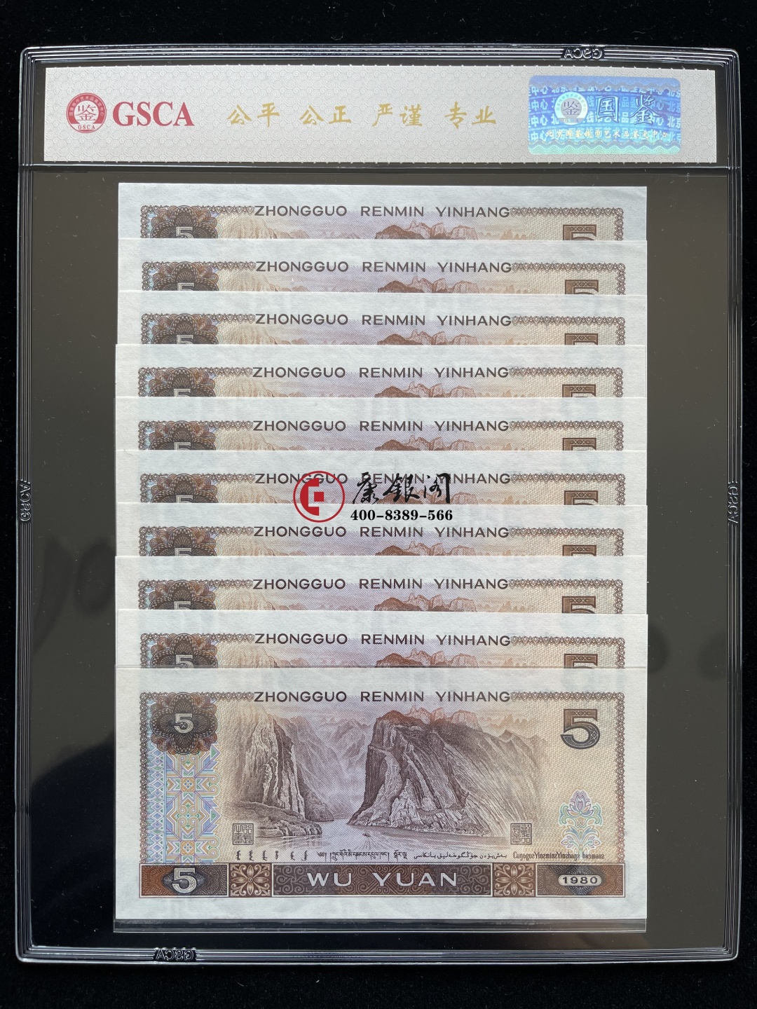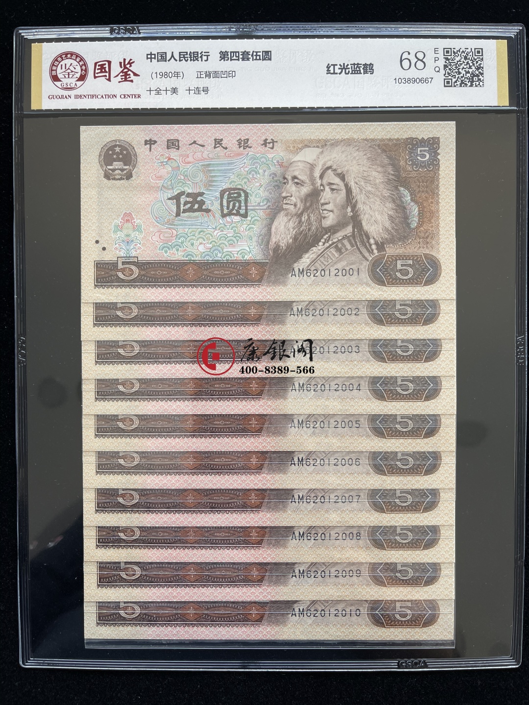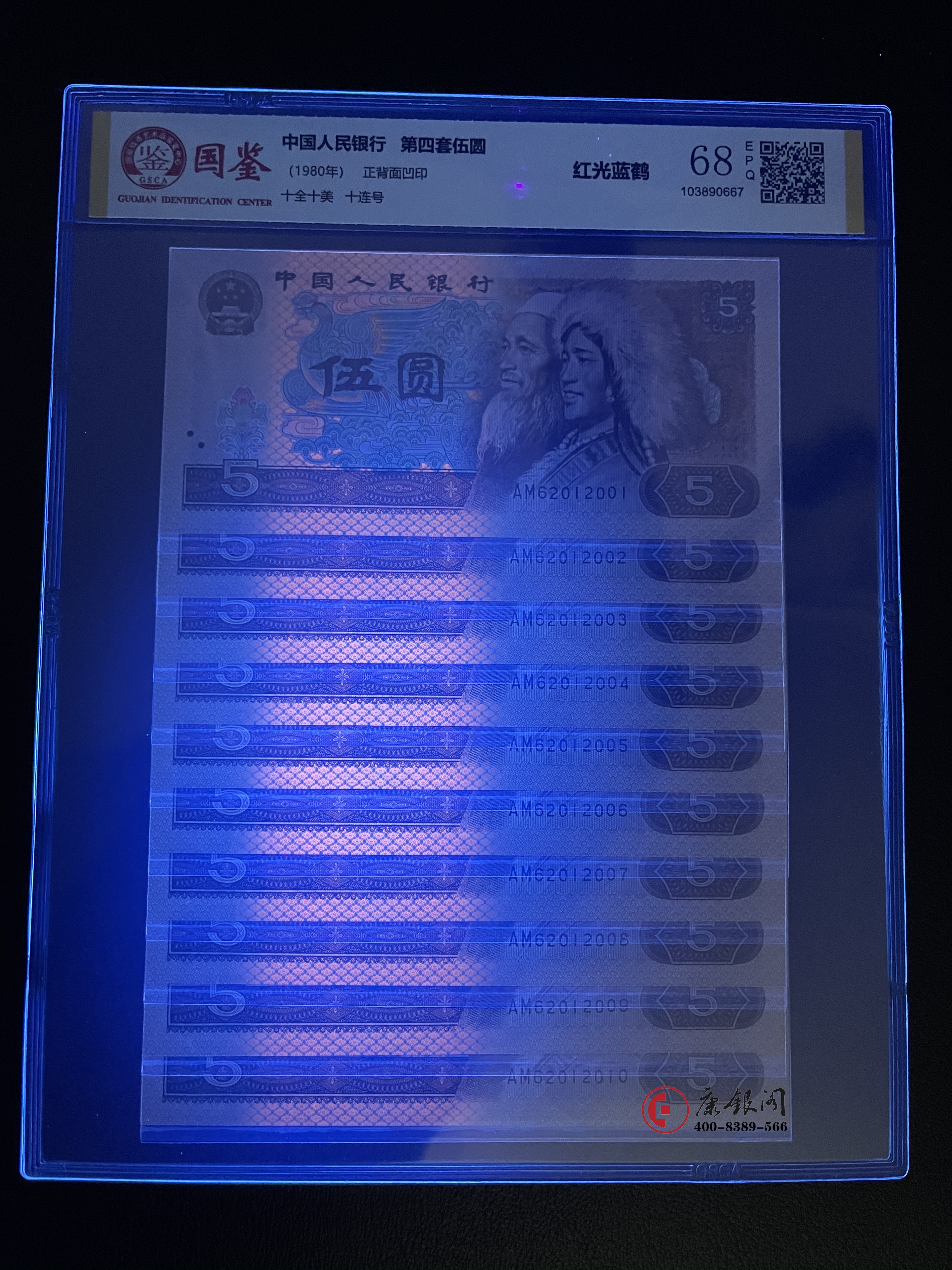 【藏品名称】四版币80版5元红光蓝鹤十连号