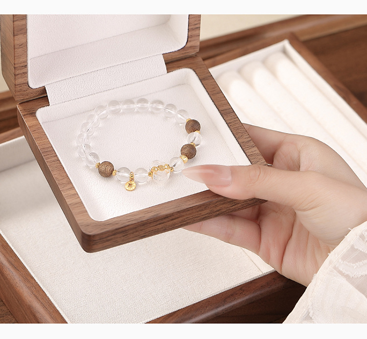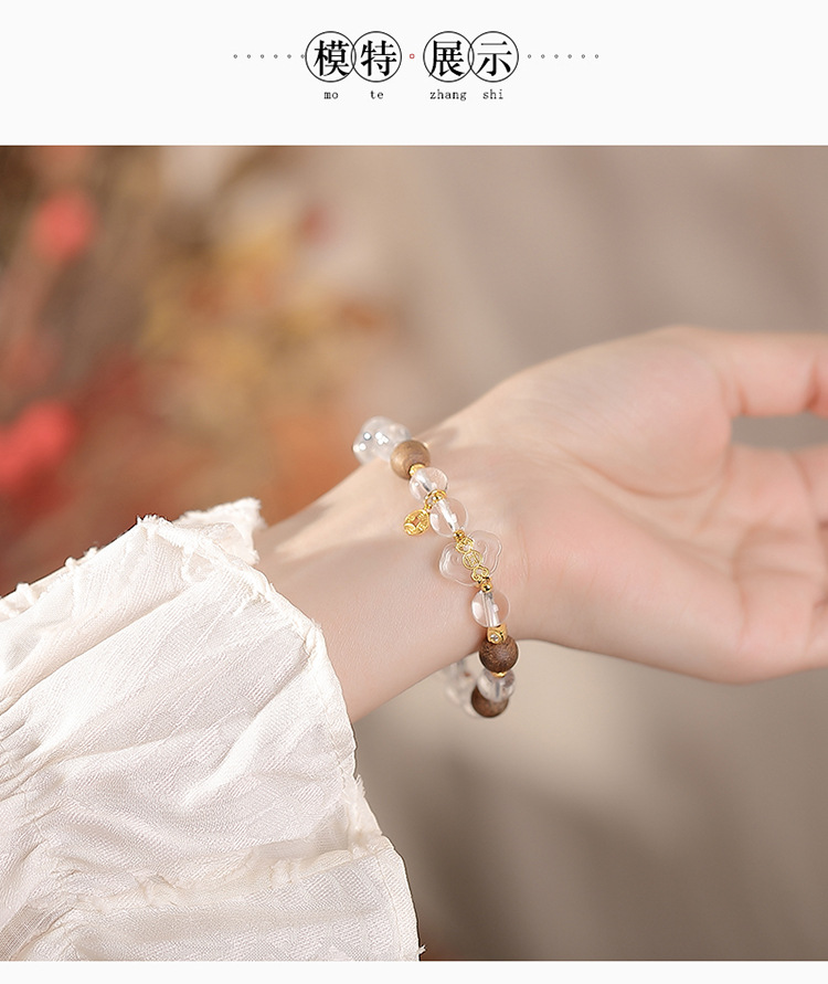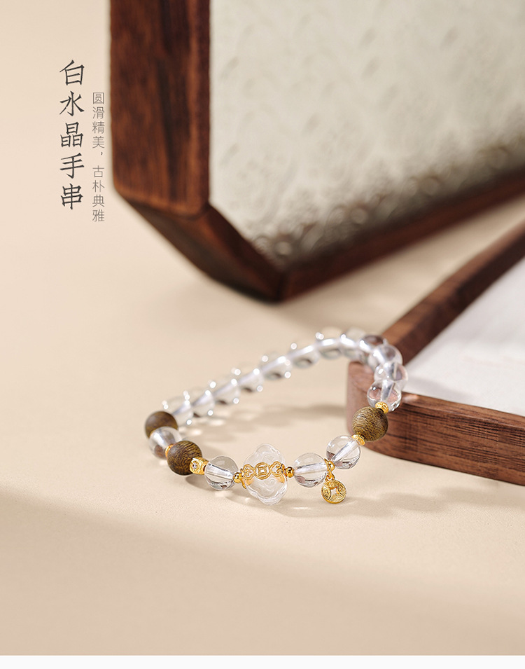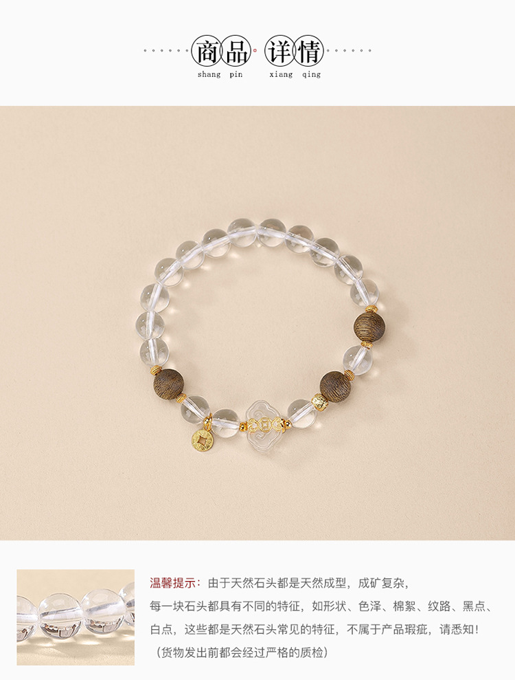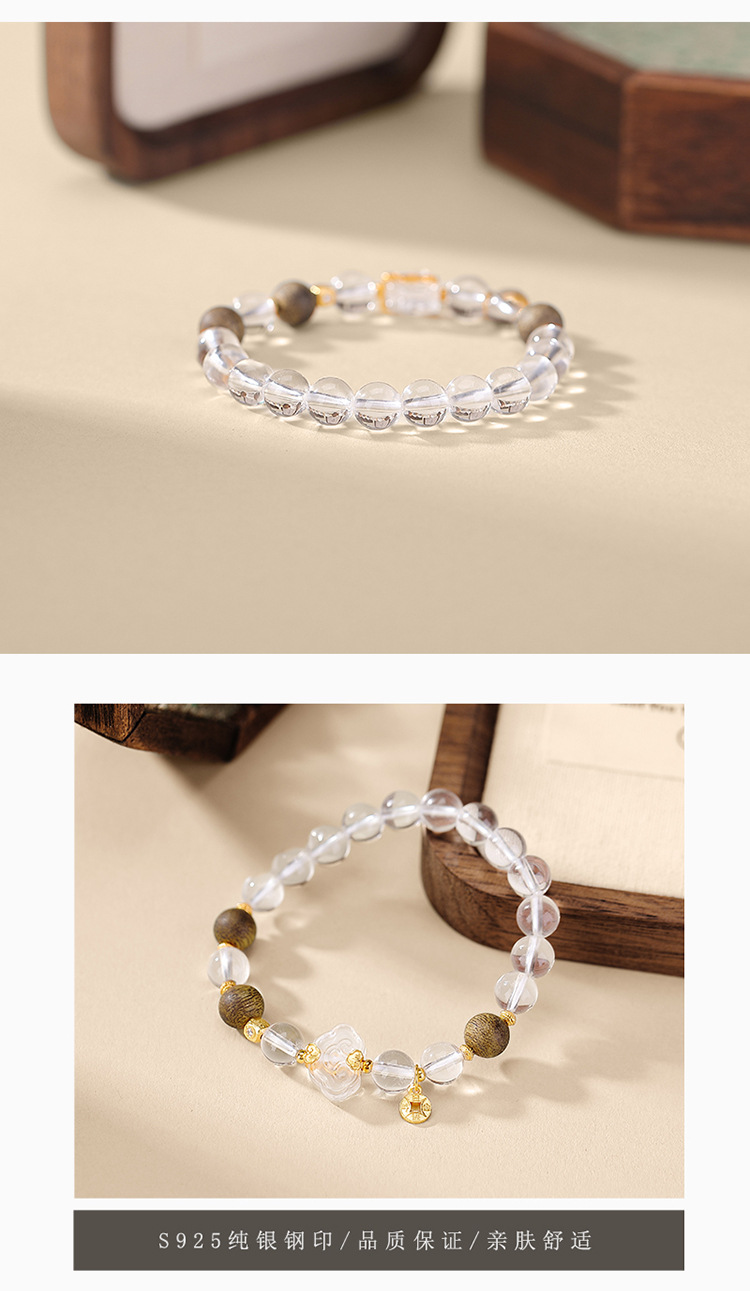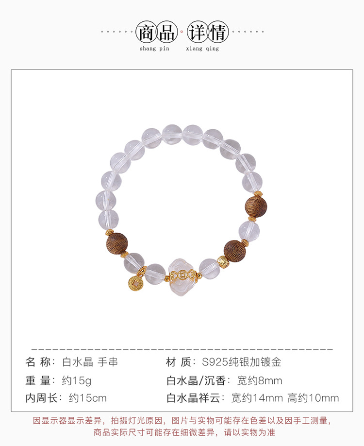 【日进斗金】S925纯银镀金白水晶沉香如意铜钱圆珠手链【CW-23216】
