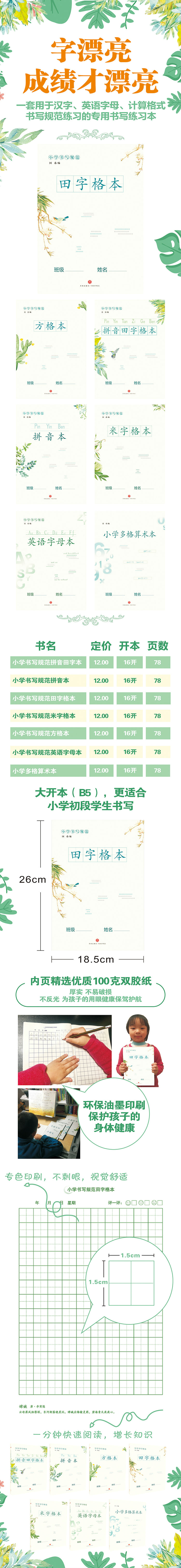 田字格能够帮助小学生更好地抓住字的结构、笔画,处理结构关系,找到相应的参照系,将汉字书写得重心平稳、疏密均称。《小学书写规范田字格本》是用于汉字书写练习的专用练习本。