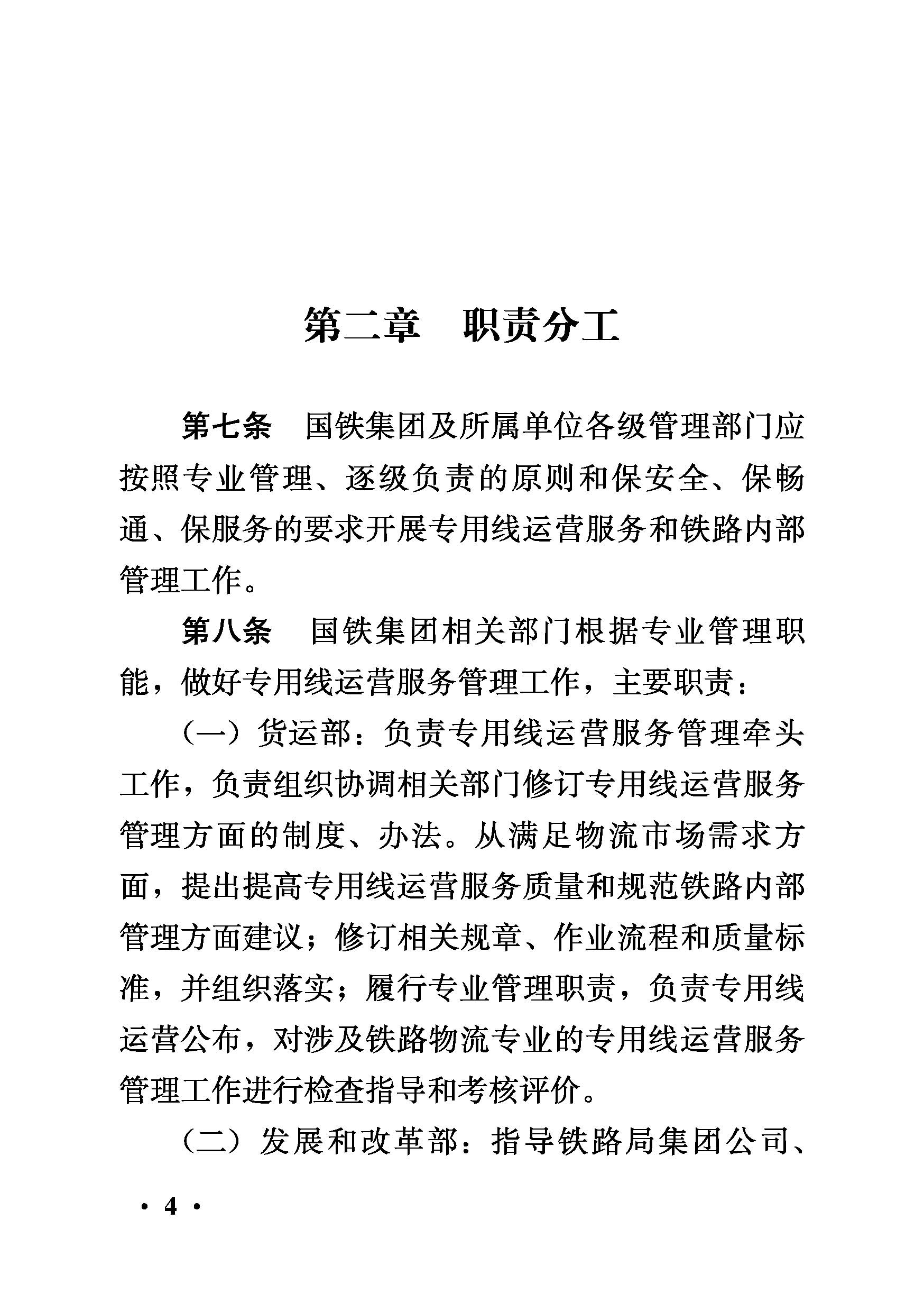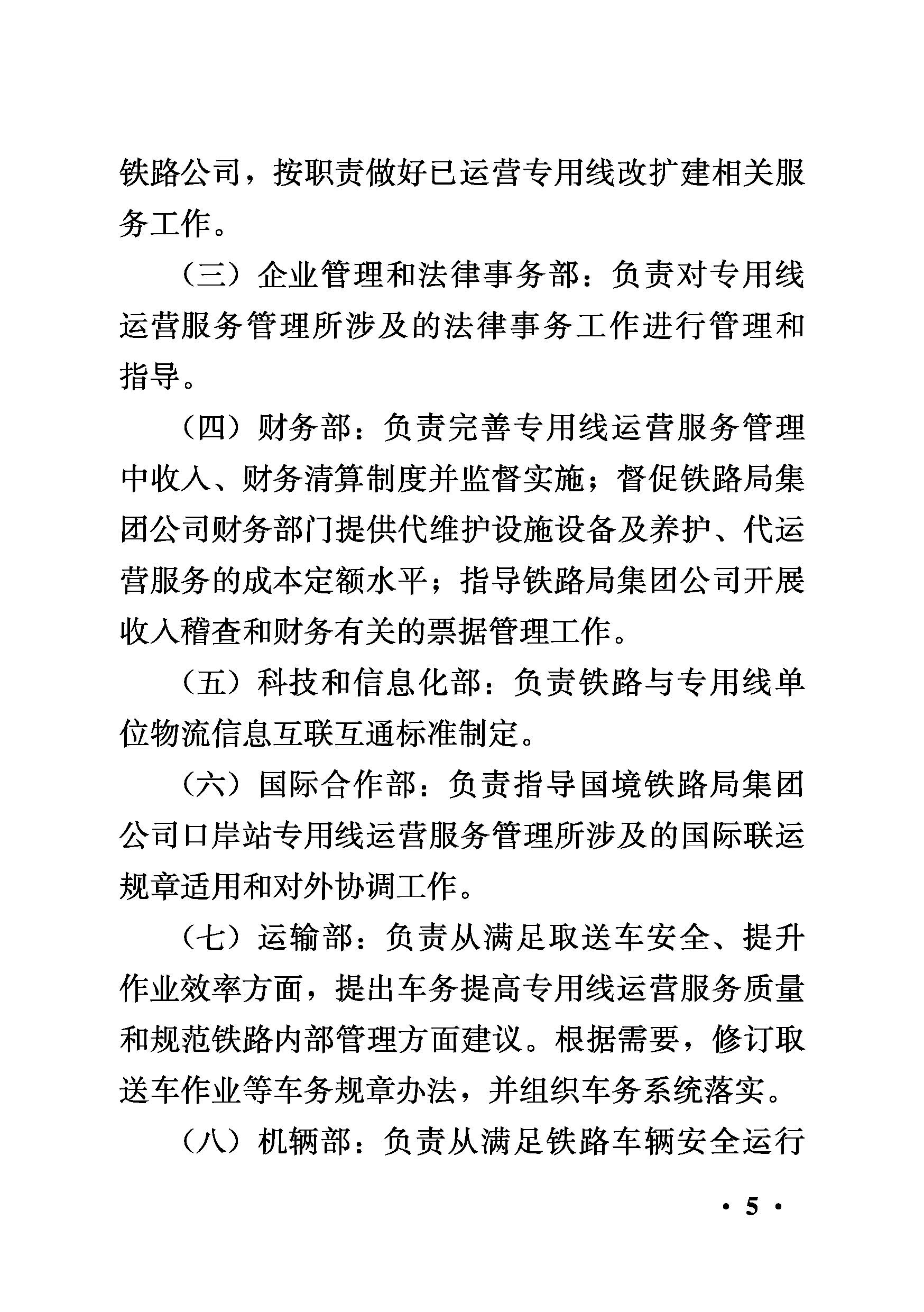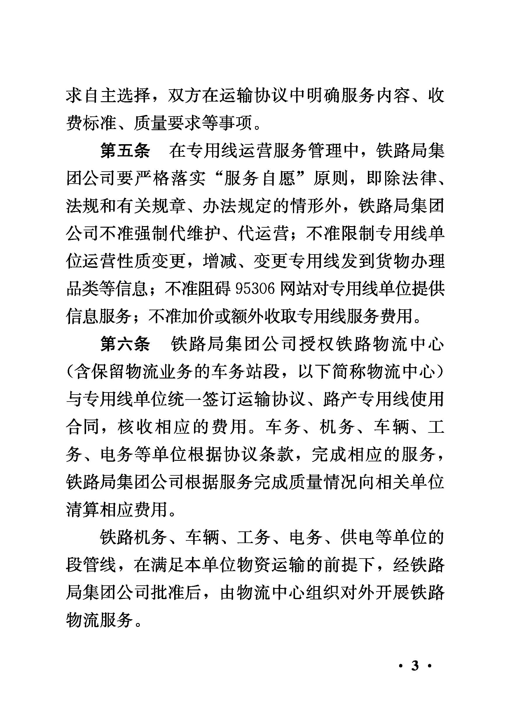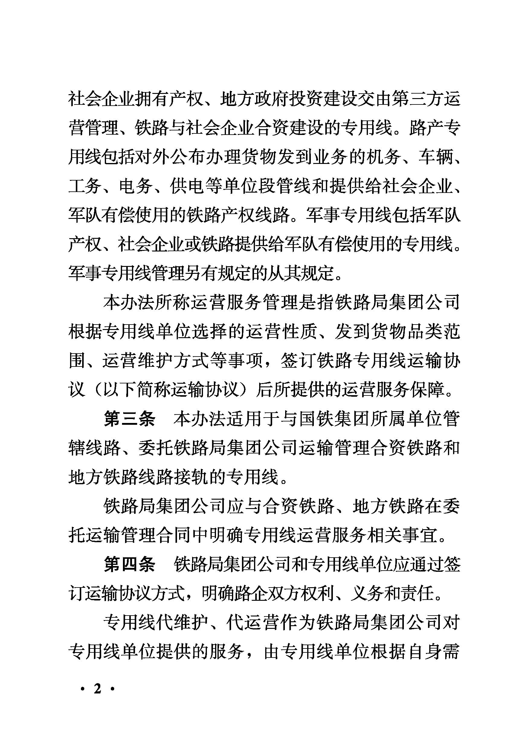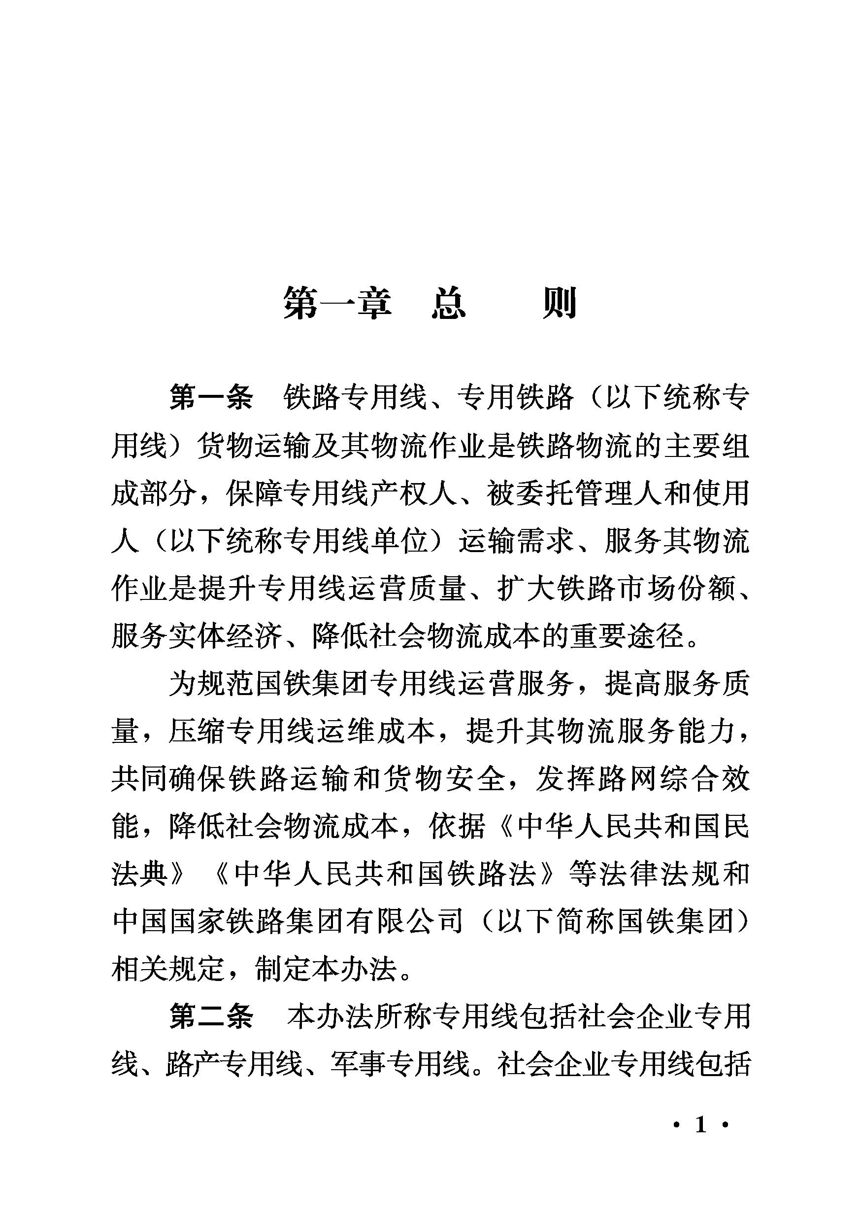 为规范国铁集团专用线运营服务,提高服务质量,压缩专用线运维成本,提升其物流服务能力,共同确保铁路运输和货物安全,发挥路网综合效能,降低社会物流成本,依据《中华人民共和国民法典》《中华人民共和国铁路法》等法律法规和中国国家铁路集团有限公司相关规定,制定《铁路专用线运营服务管理办法》。本办法共七章五十二条,各章分别为总则、职责分工、基本规范、安全生产、运营管理、运营服务、附则,适用于与国铁集团所属单位管辖线路、委托铁路局集团公司运输管理合资铁路和地方铁路线路接轨的专用线。