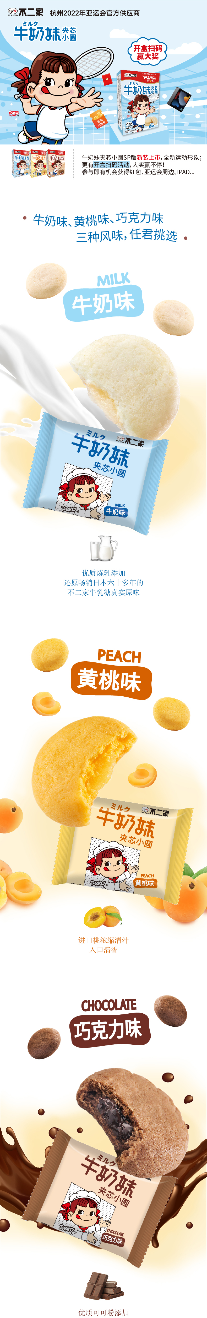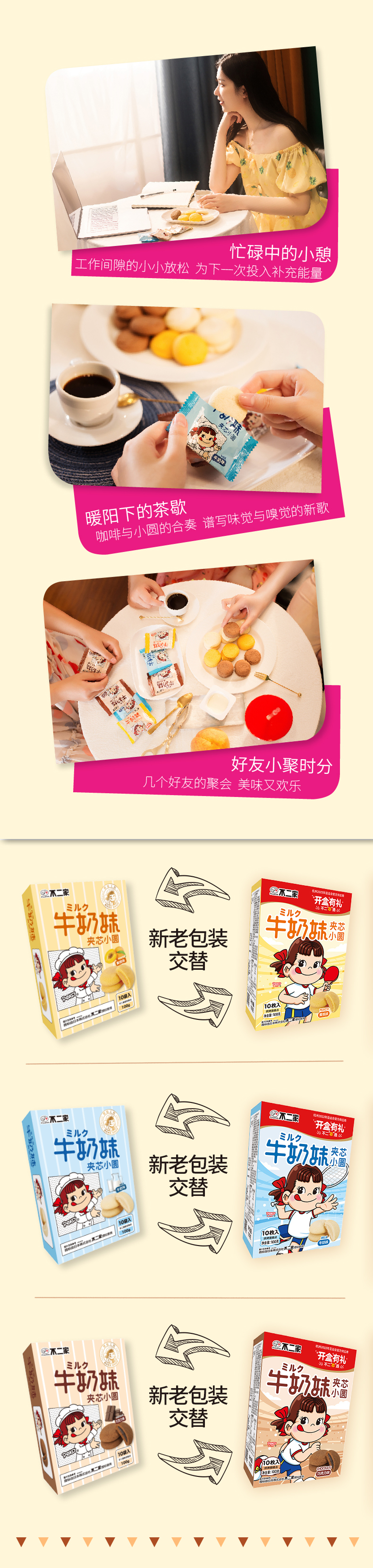 不二家牛奶妹夹芯小圆100g 牛奶味/黄桃味/巧克力味 内含夹心口感层次丰富 151084/151085/151086