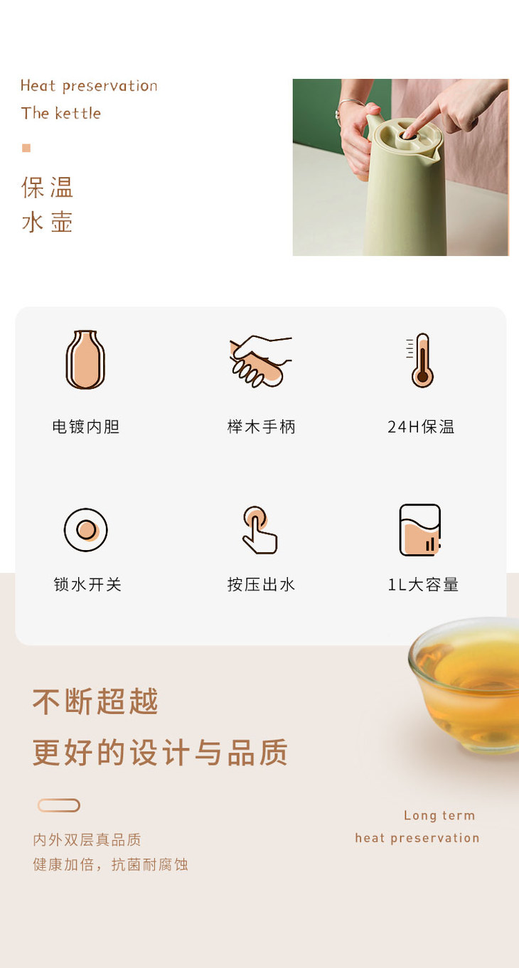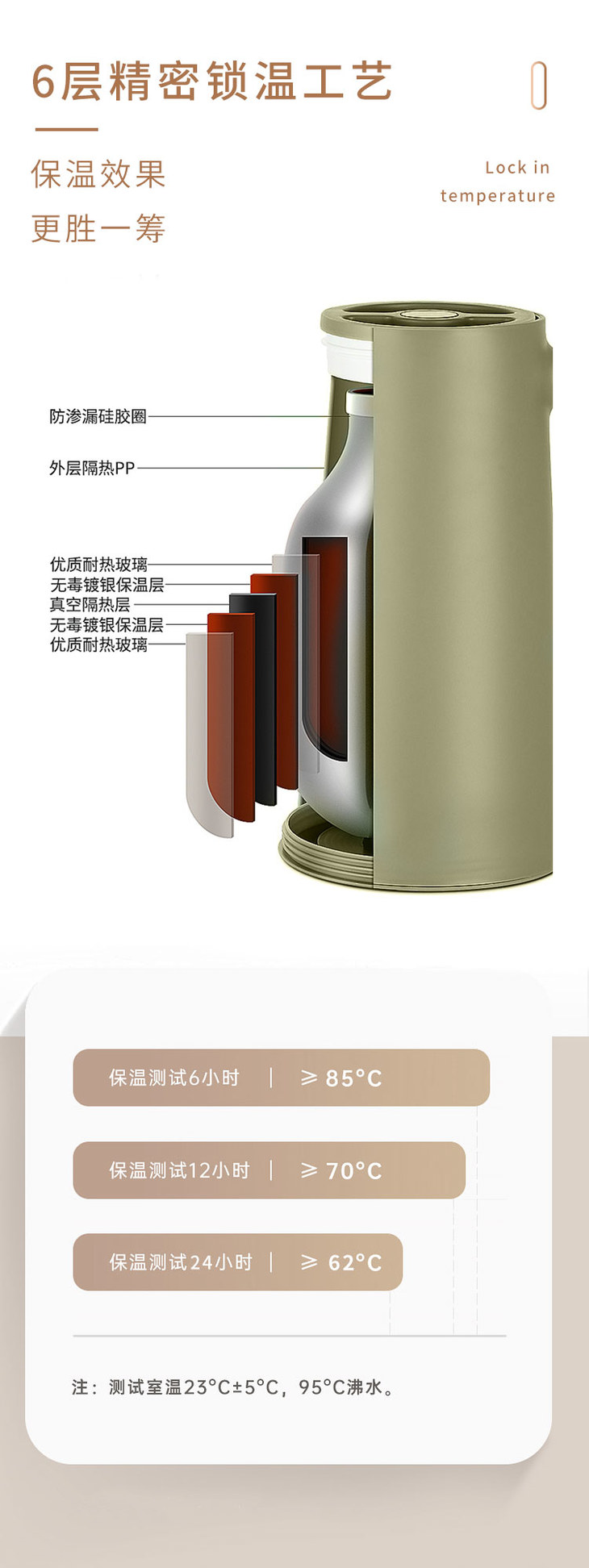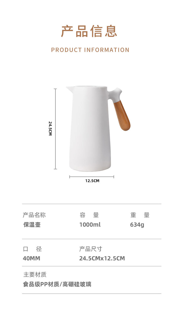 【北欧风简约保温水壶】24小时持续保温!1000ml大容量真空玻璃内胆,便携小型家用办公保温水壶!