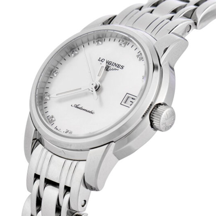 镜面 材质 | 蓝宝石水晶玻璃 | 表盘 | 精钢表壳 白色珍珠贝母表盘 钻石时标,镀银抛光指针Super-LumiNova夜光,表盘镶嵌11颗顶级韦塞尔顿VS级钻石,总重0.031克拉。 大三针 日期显示 透底 |