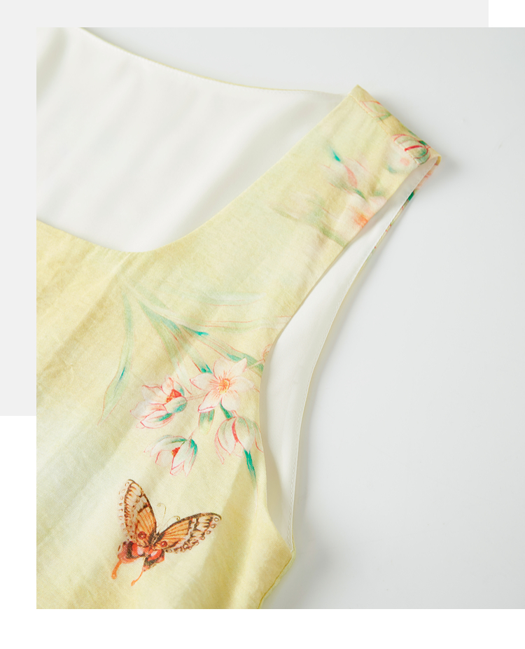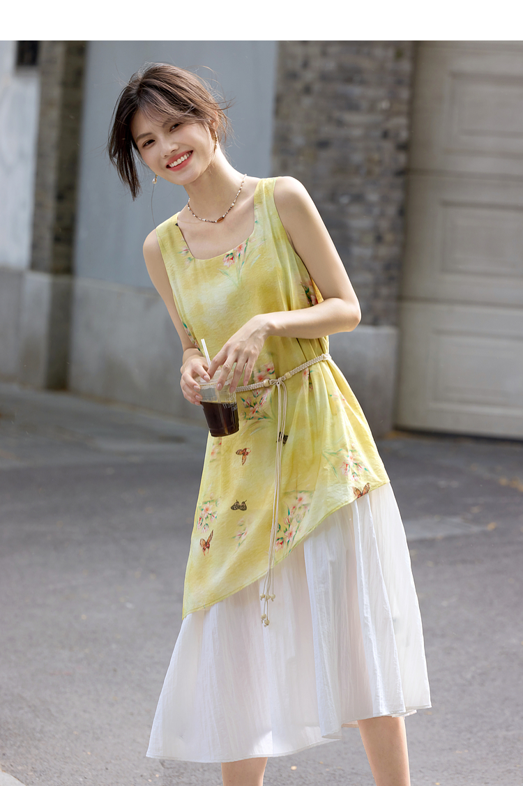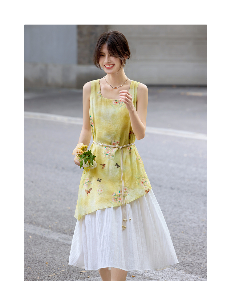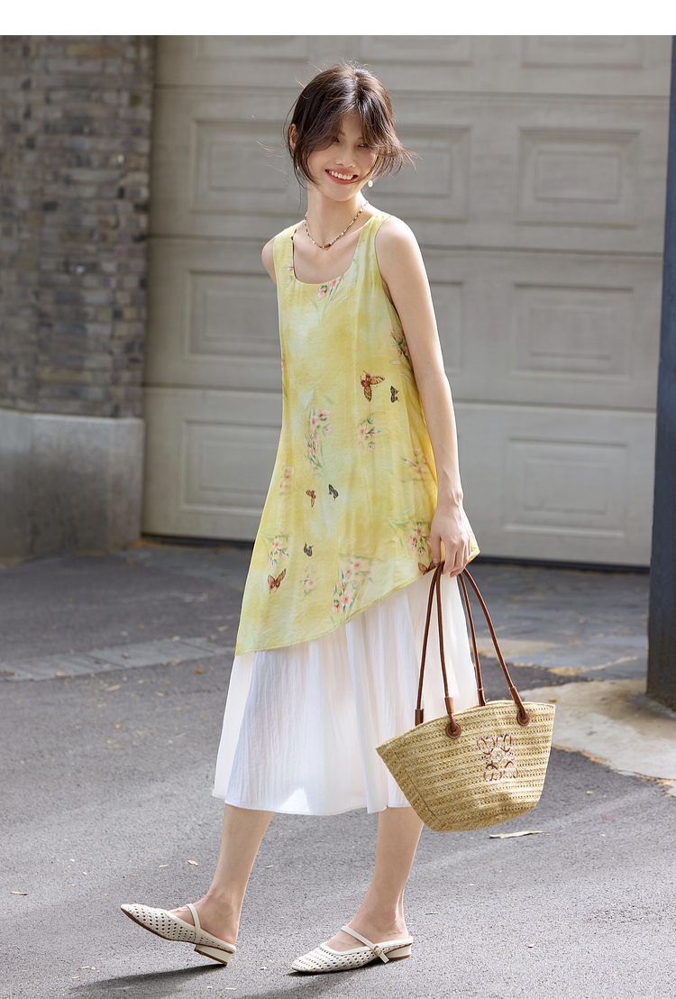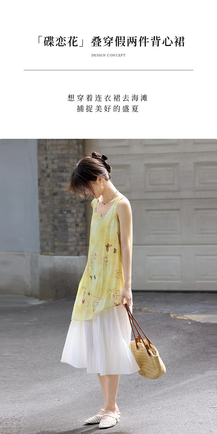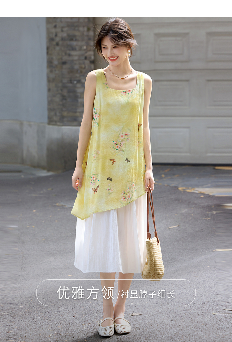 【周末秒杀】熙世界「碟恋花」轻国风假两件印花方领背心连衣裙女2025夏季新款