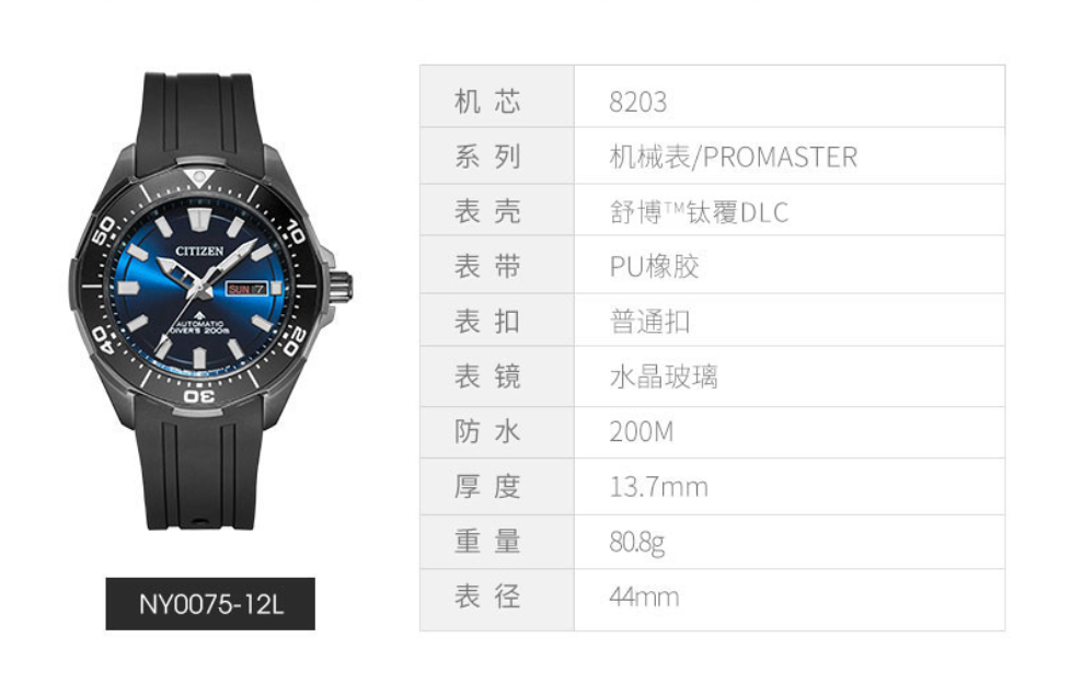 西铁城(CITIZEN)自动机械男表舒博钛覆DLC表壳潜水休闲时尚款NY0075-12L