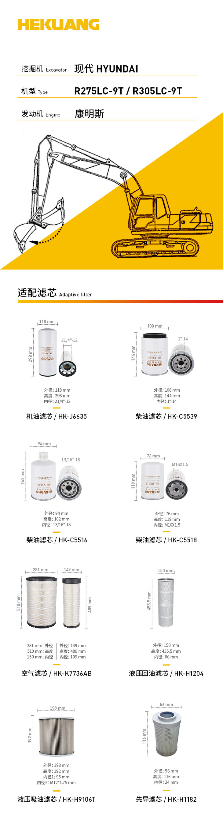 现代R275LC-9T、R305LC-9T(康明斯)挖掘机滤芯 机油柴油空气滤芯 液压油先导滤芯