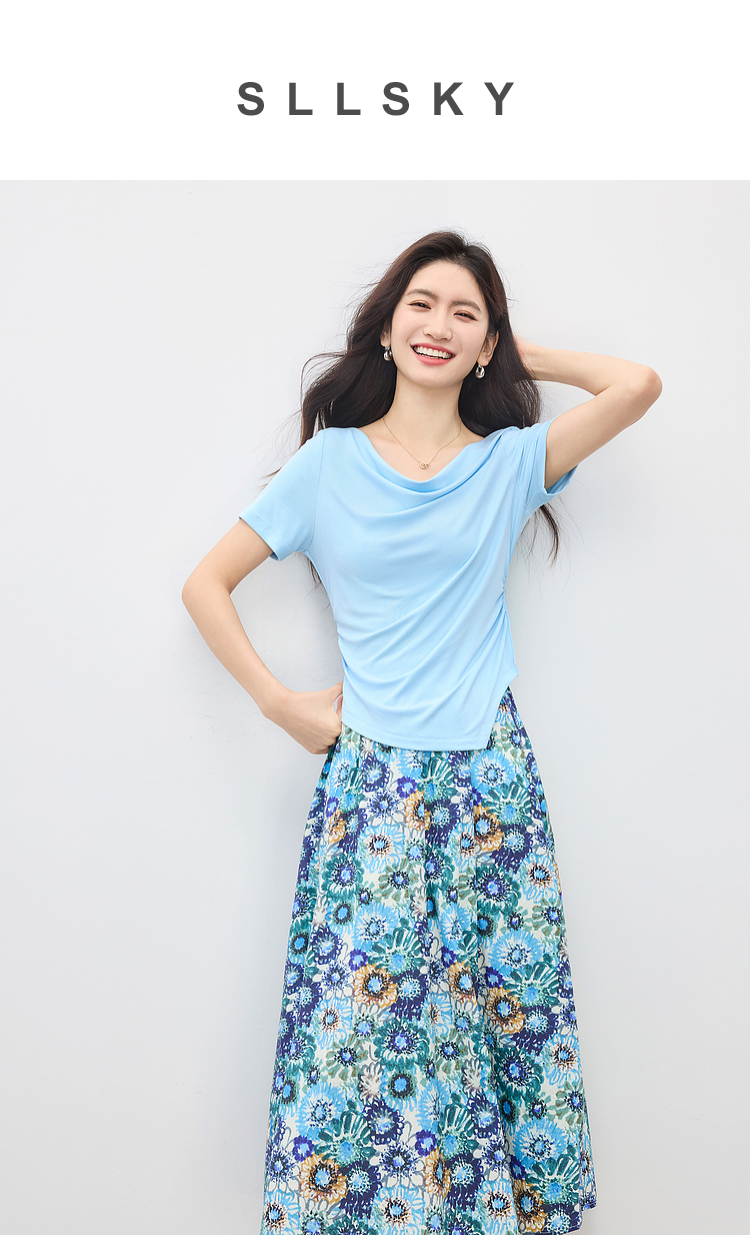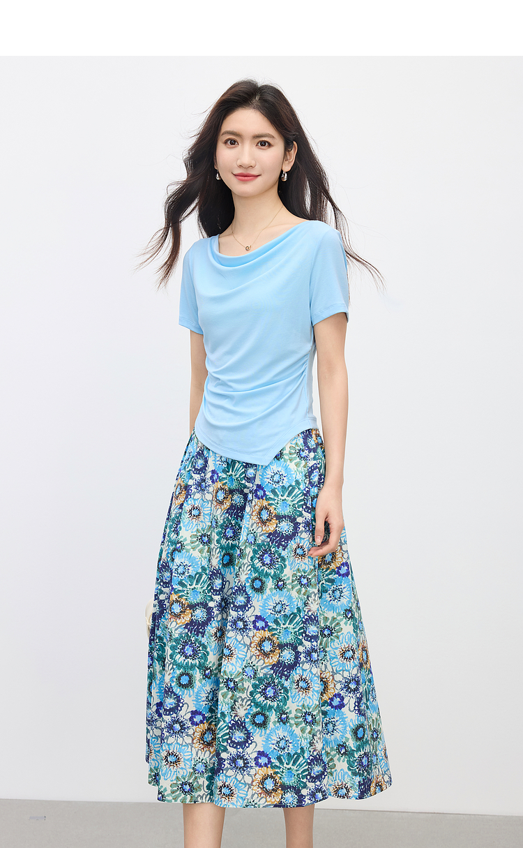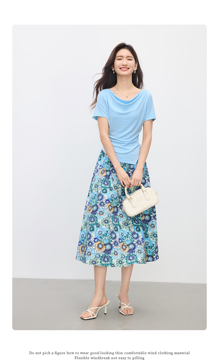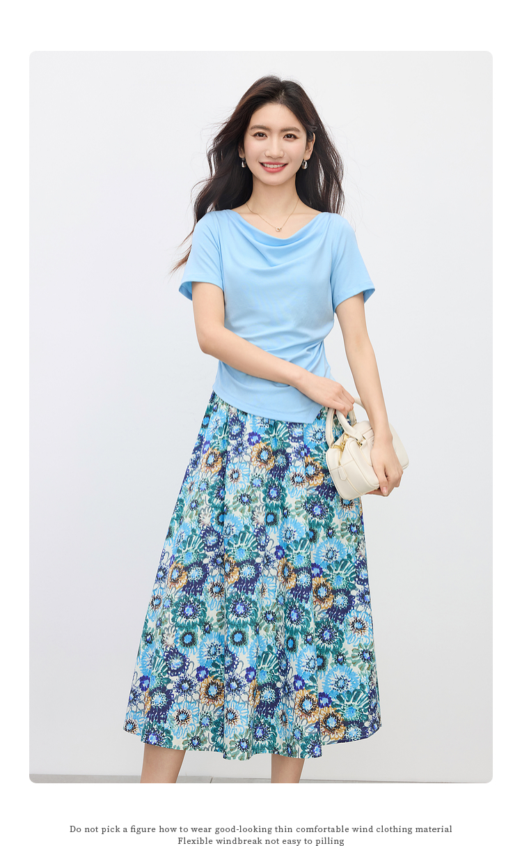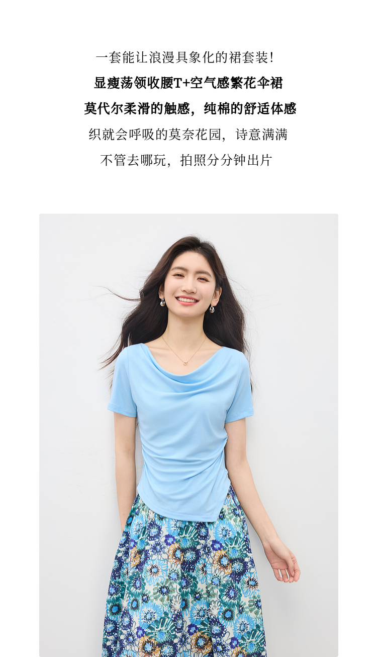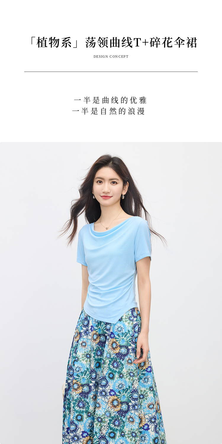 【专属特价】熙世界独特绝美夏天小套装女新款荡领T恤复古碎花半身伞裙两件套