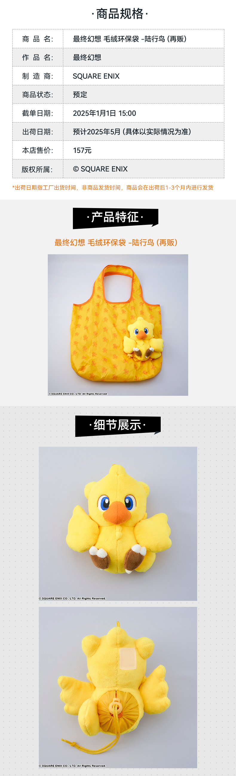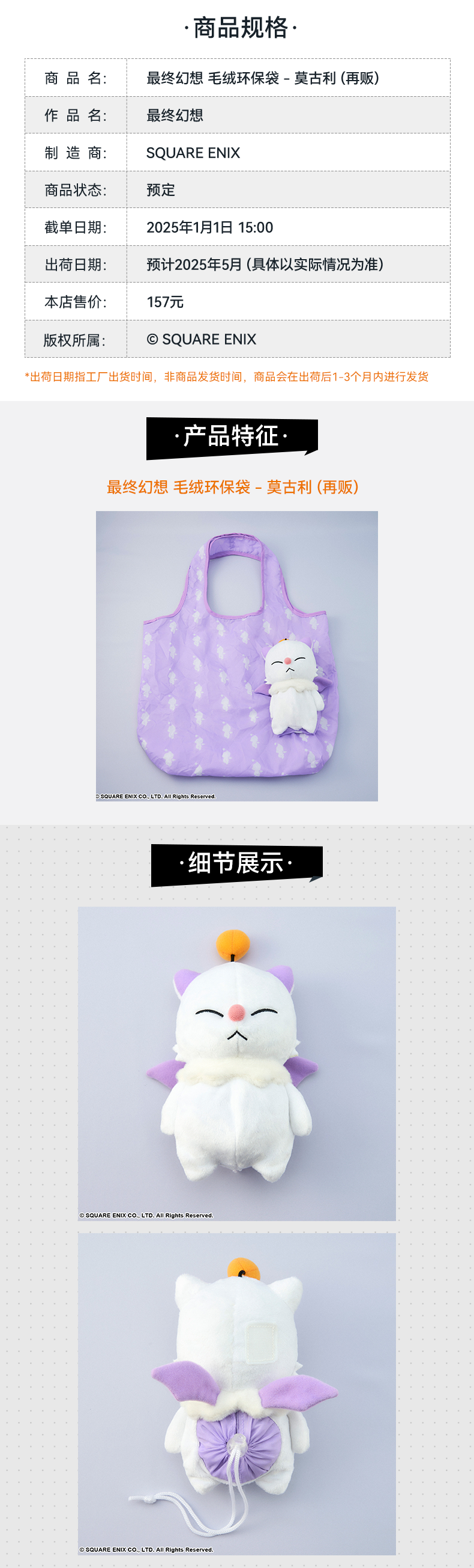 【GSC现货】最终幻想 毛绒环保袋 - 莫古利/陆行鸟