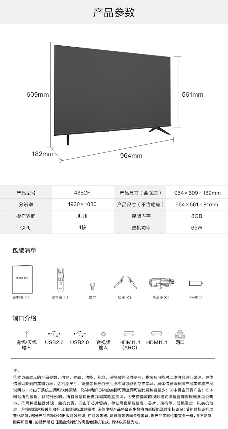 海信电视 43E2F 43英寸全高清智能投屏Unibody悬浮全面屏 家用网络液晶平板教育电视机