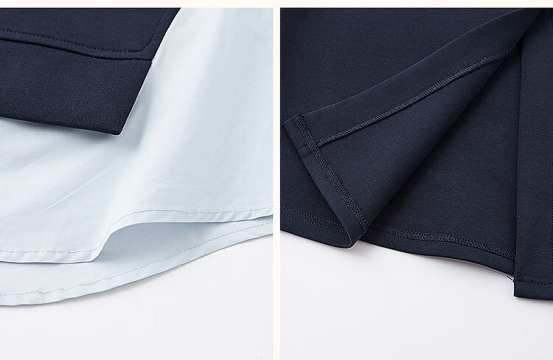 【材质】:针织面料:82.7%聚酯纤维,12%粘纤, 5.3%氨纶; 梭织面料:100%棉