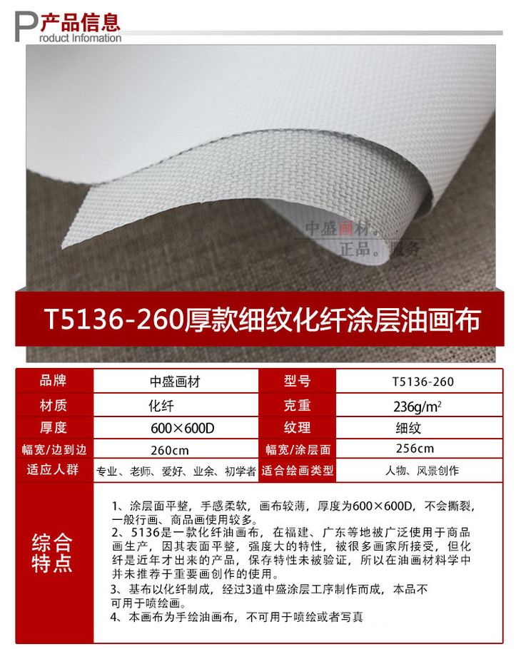 幅宽260CM 细纹化纤涂层油画布5136 中盛画材 商品画专用