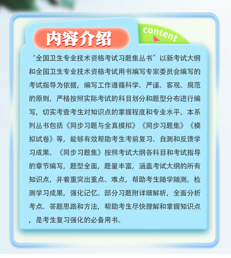 “全国卫生专业技术资格考试习题集丛书”以新考试大纲和全国卫生专业技术资格考试用书编写专家委员会编写的考试指导为依据,编写工作遵循科学、严谨、客观、规范的原则,严格按照实际考试的科目划分和题型分布进行编写,切实考查考生对知识点的掌握程度和专业水平。本系列丛书包括《同步习题与全真模拟》《同步习题集》《模拟试卷》等,能够有效帮助考生考前复习、自测和反馈学习成果。《同步习题集》按照考试大纲各科目和考试指导的章节编写,题型全面,题量丰富,涵盖考试大纲的所有知识点,并着重突出重点、难点,帮助考生随学随测,检测学习成果,强化记忆。部分习题附详细解析,全面分析考点、答题思路和方法,帮助考生尽快理解和掌握知识点,是考生复习强化的必备用书。