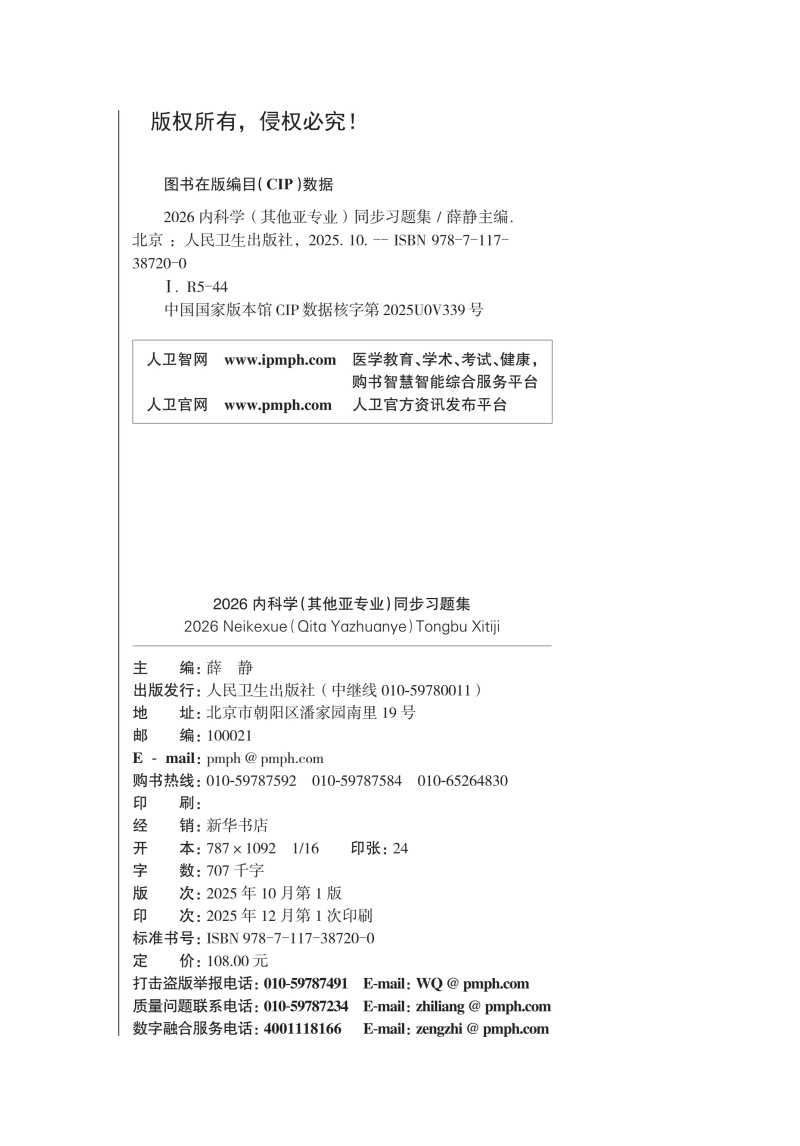 2026内科学(其他亚专业)同步习题集 全国卫生专业技术资格考试习题集丛书 薛静 主编 考试用书 2026职称考试 人民卫生出版社
