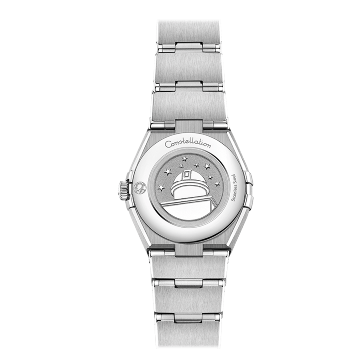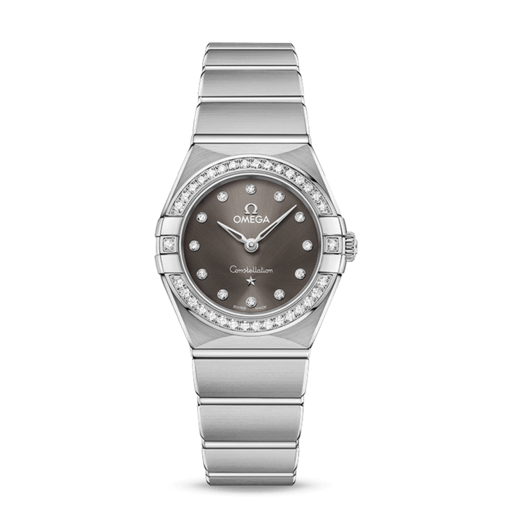镜面材质 | 蓝宝石水晶玻璃 | 表盘 | 经典的半月形切面、“托爪”以及mono-rang表链。 精钢腕表,表圈铺镶钻石,灰色太阳纹饰表盘,饰有钻石小时刻度,覆以耐磨损蓝宝石玻璃表镜。指针、欧米茄品牌标识、星座徽标以及钻石托槽以白色18K金打造而成。 密底,表背印有星座天文台徽章。 |