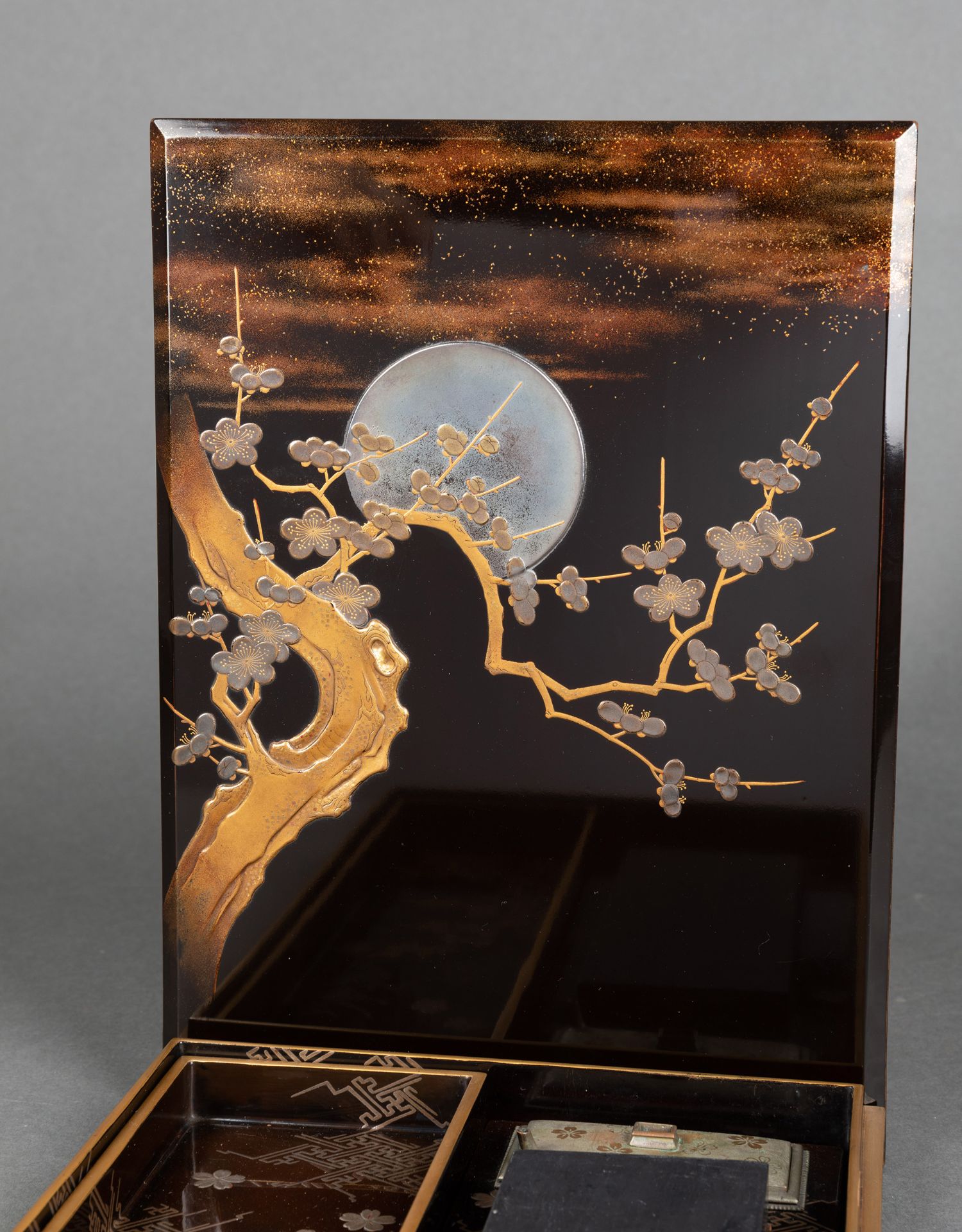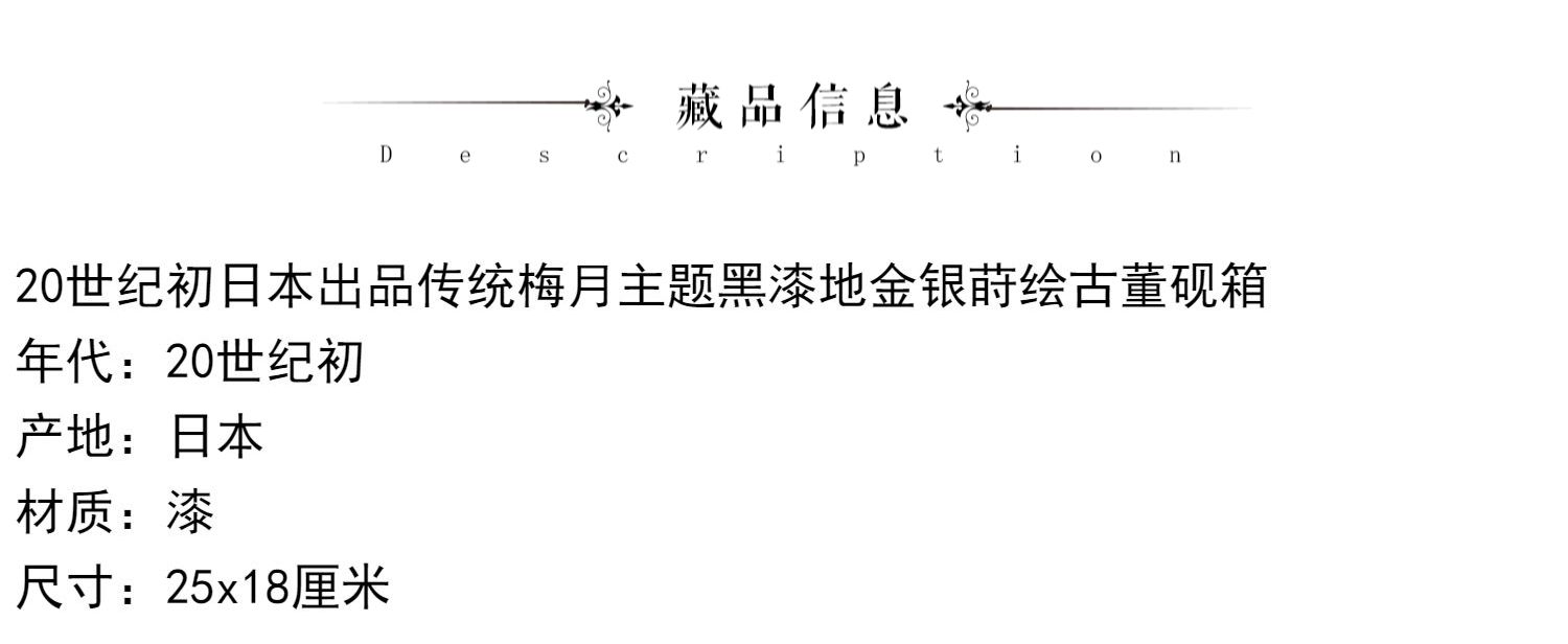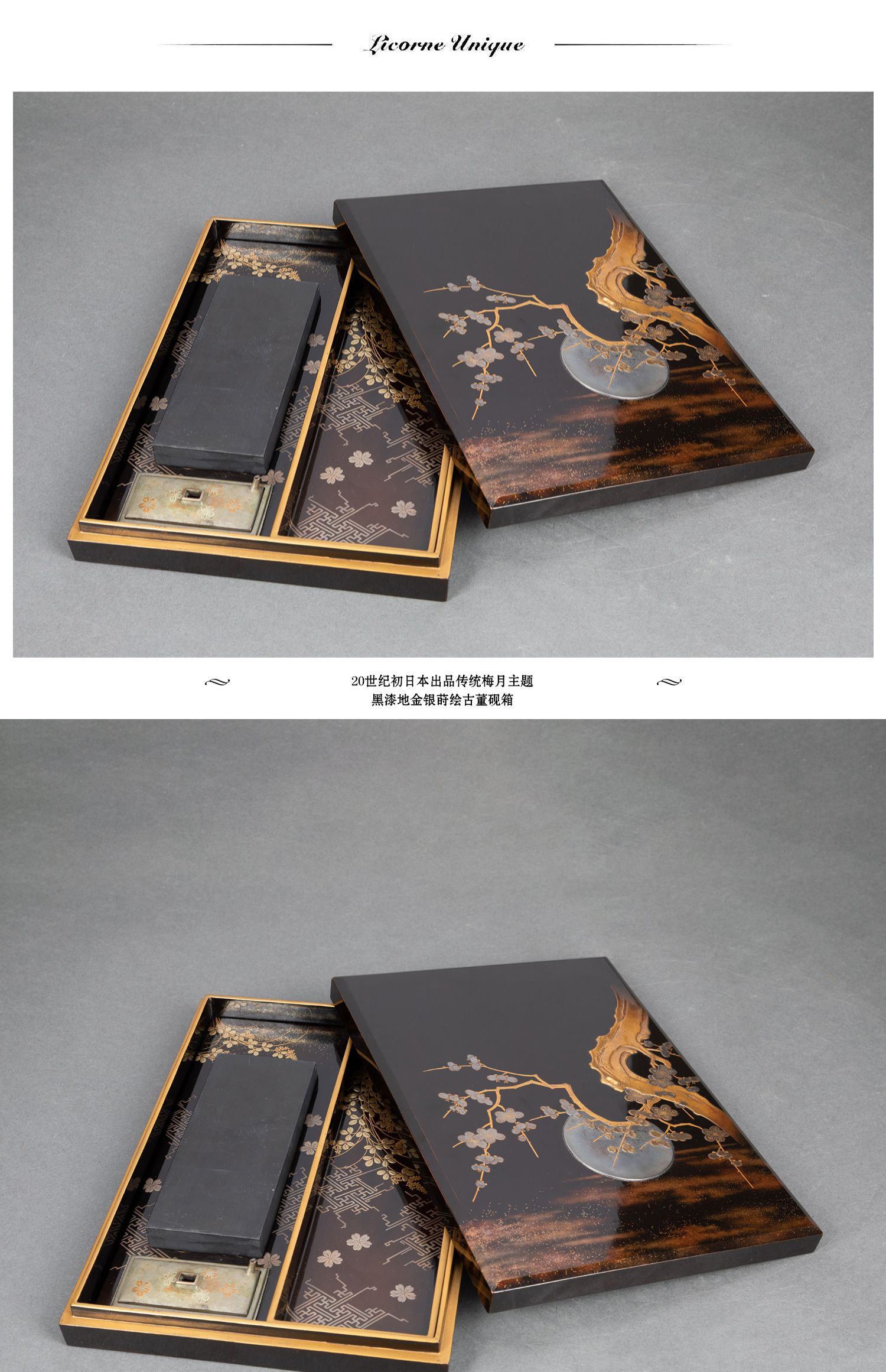 独角鹿西洋古董日本传统梅月主题黑漆地金银莳绘古董砚箱