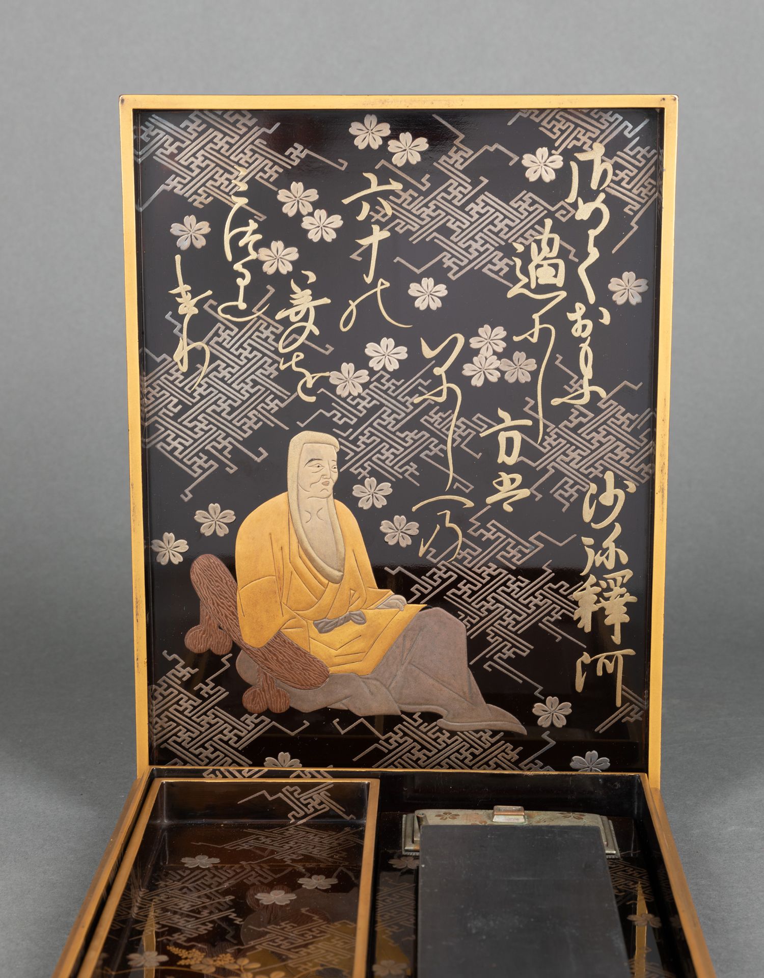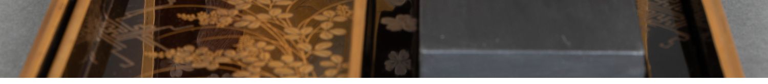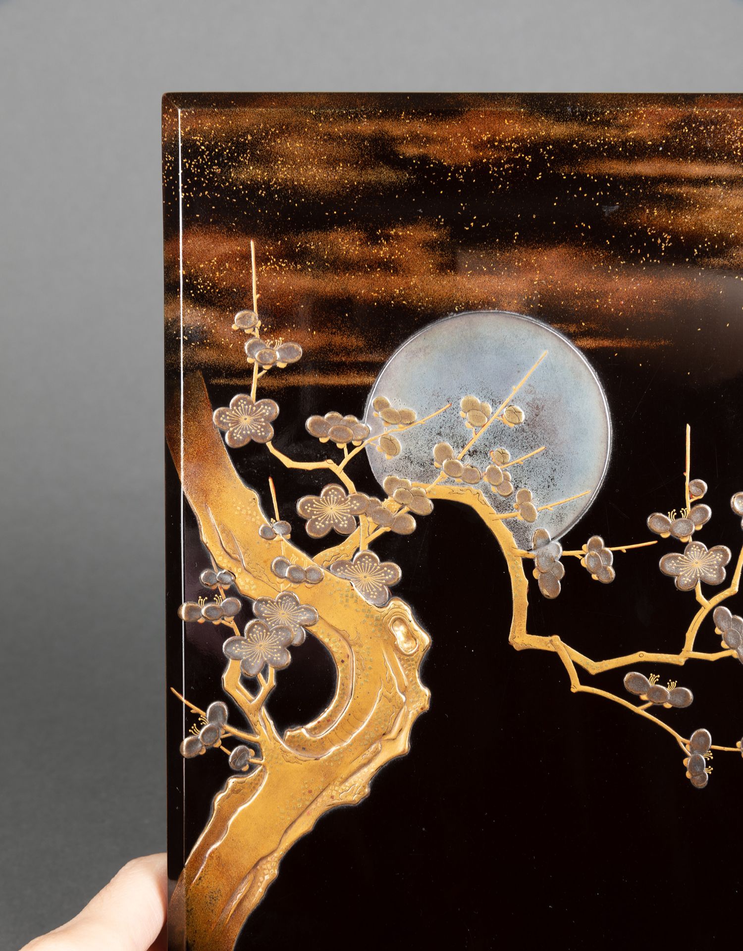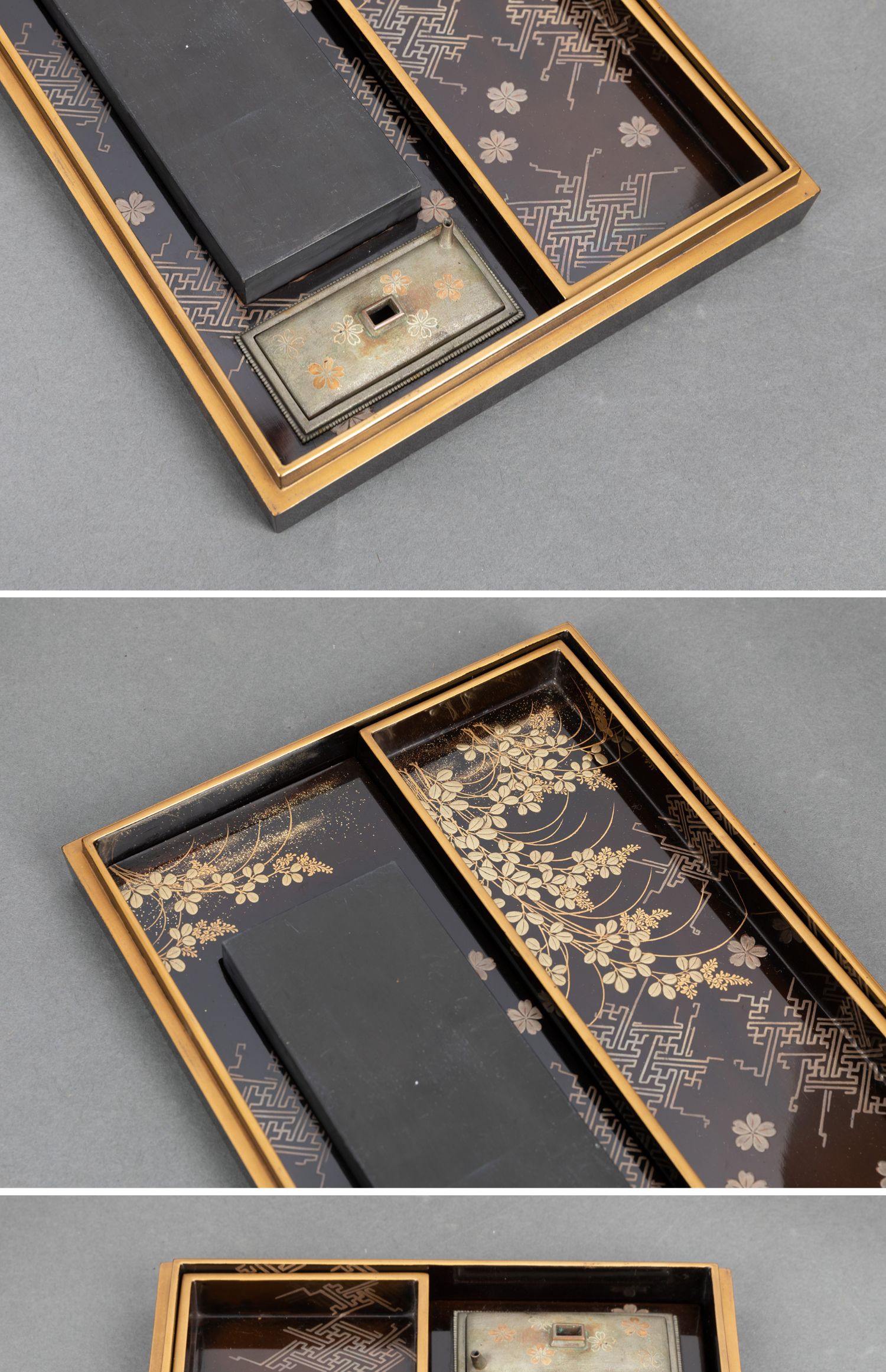 独角鹿西洋古董日本传统梅月主题黑漆地金银莳绘古董砚箱