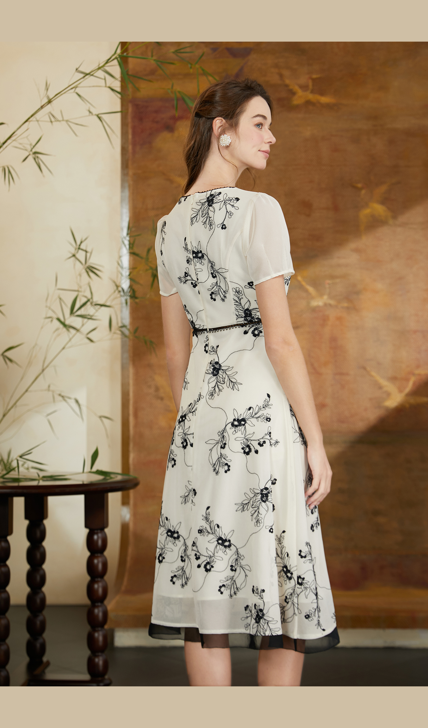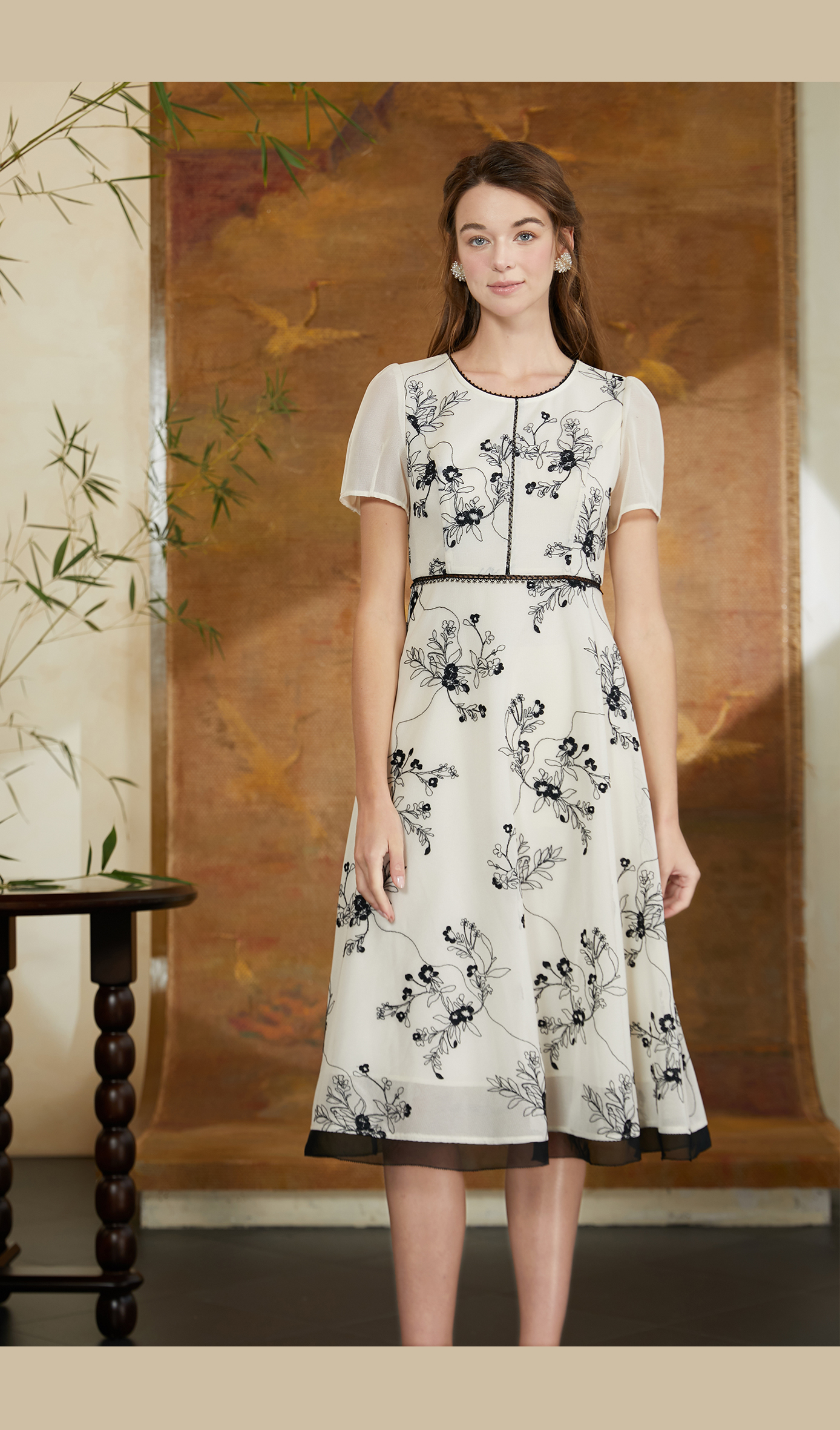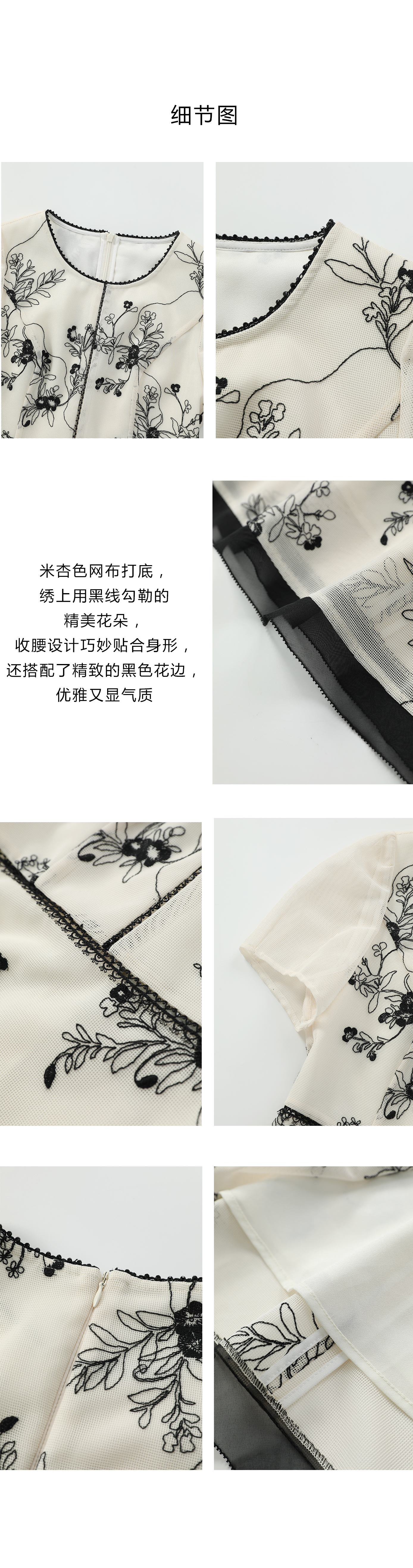 司歌网纱刺绣v领短袖连衣裙A911007X