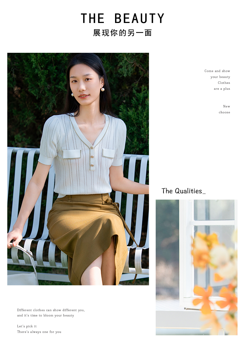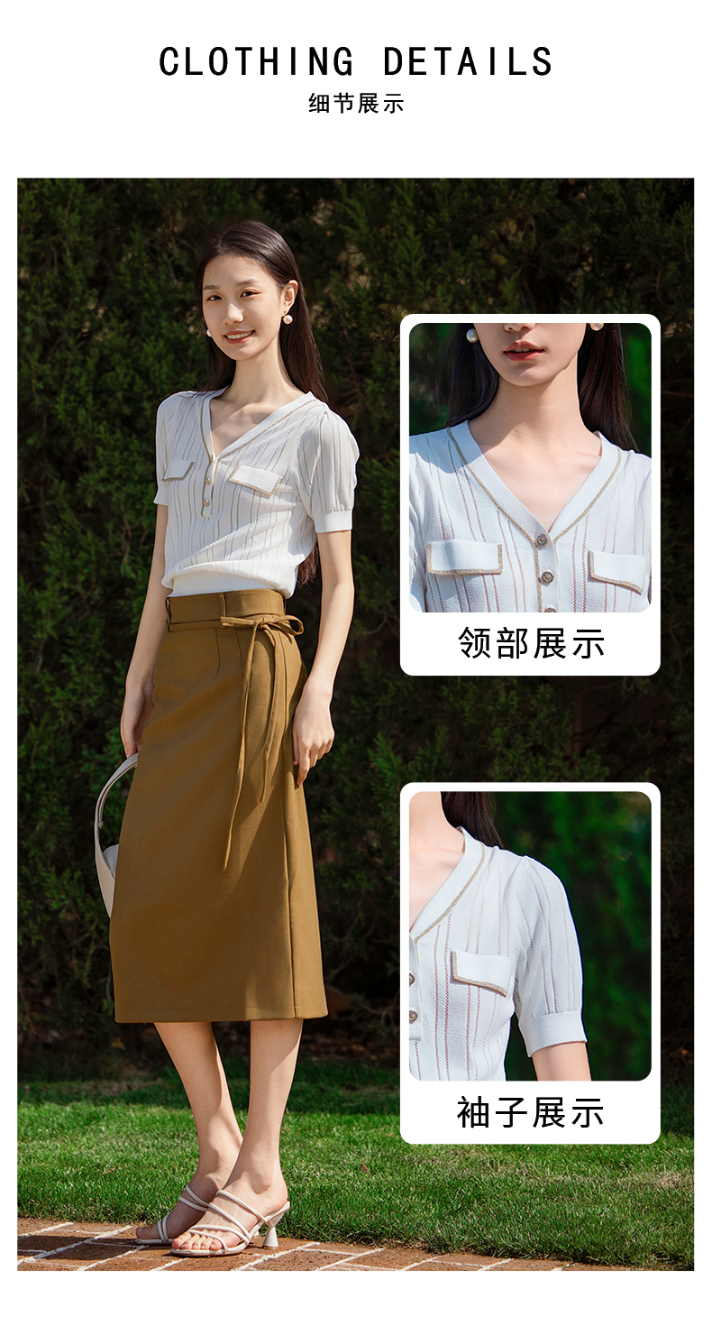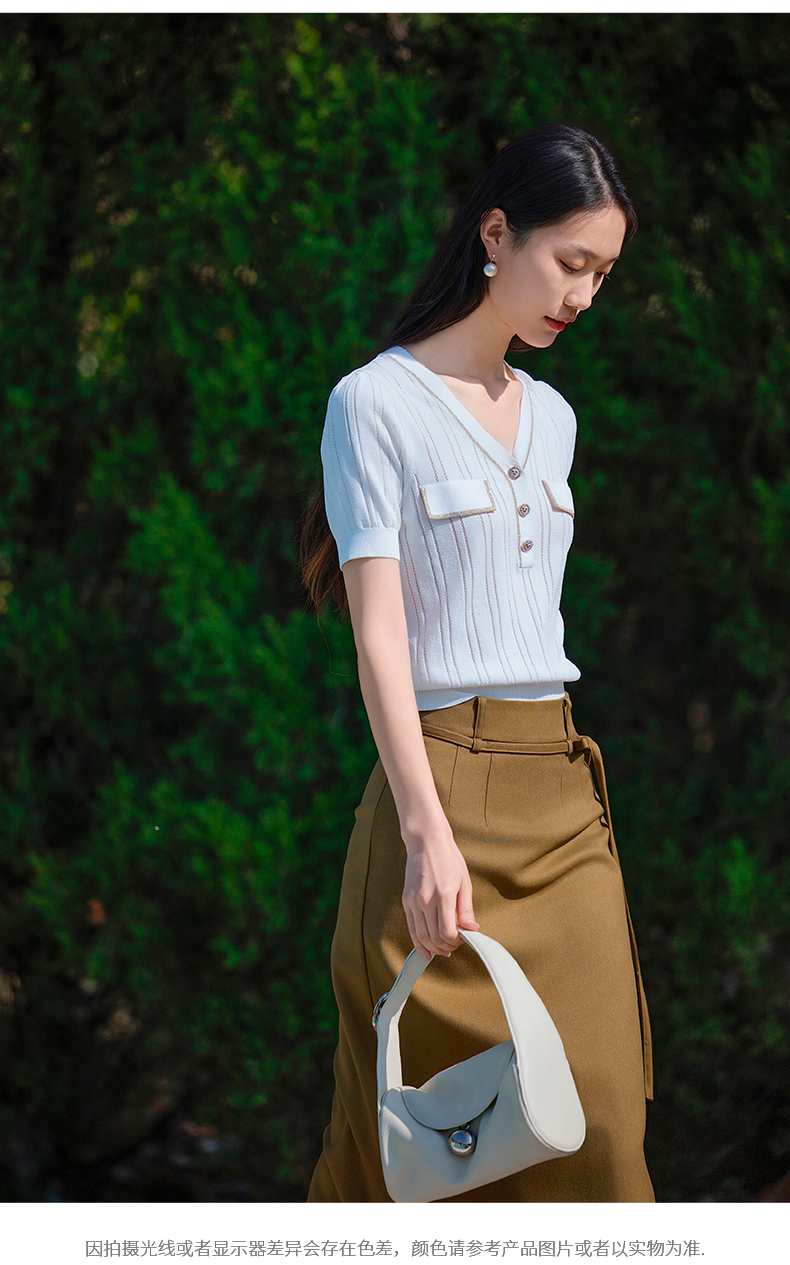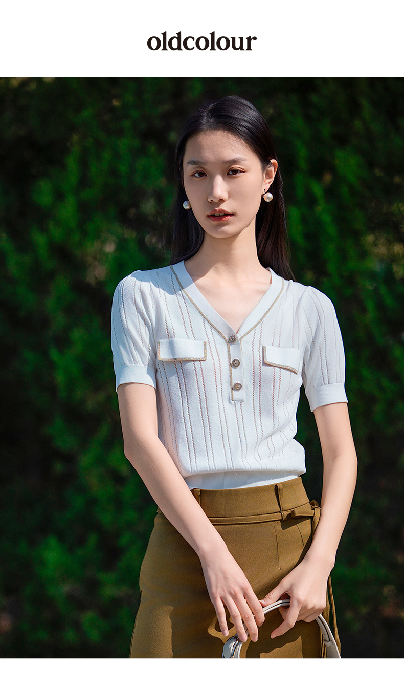 oldcolour短袖针织衫夏季新款设计感V领通勤白色上衣女P21052192