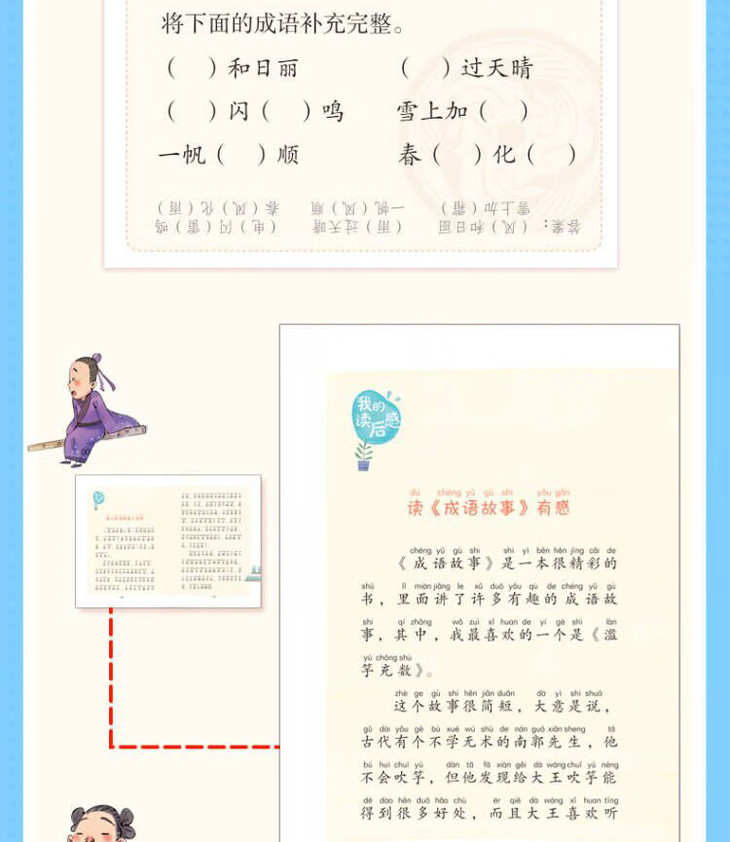 每个成语都配有出处、解释、例句,部分篇章后还配有习题,能让小学生更好地理解成语、掌握成语。