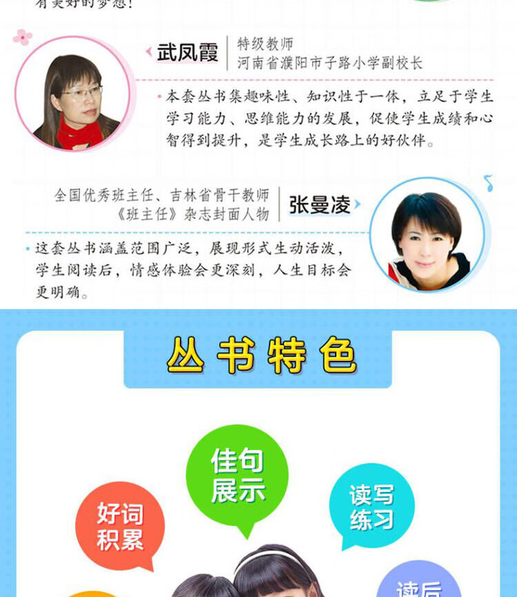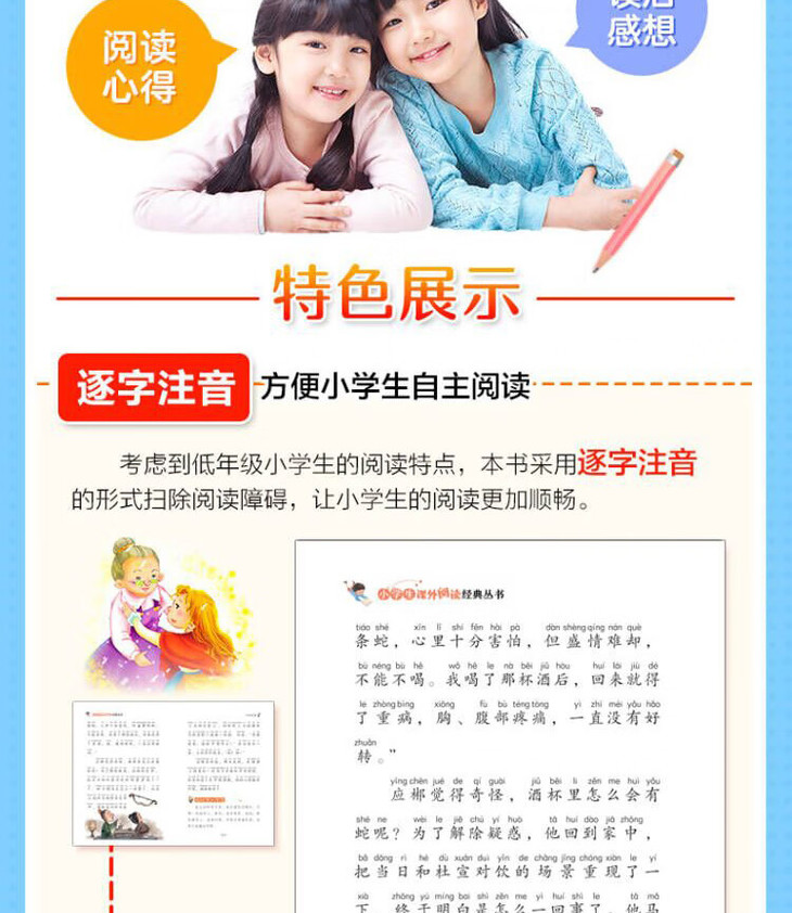 大字排版,字体优美,并加注了标准的拼音。好词用彩色字体标出,醒目而活泼。