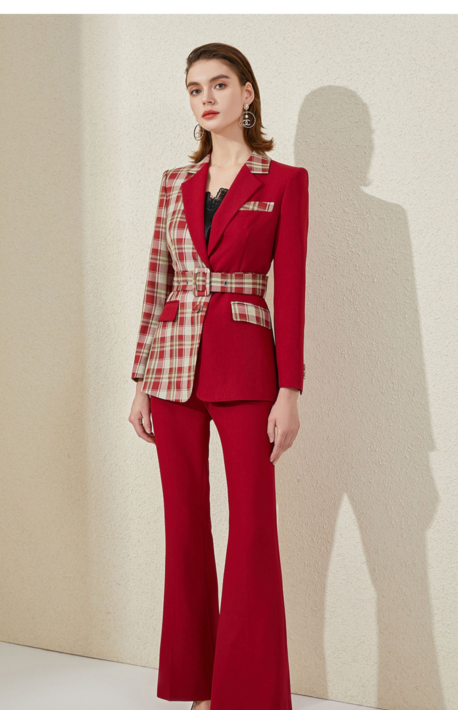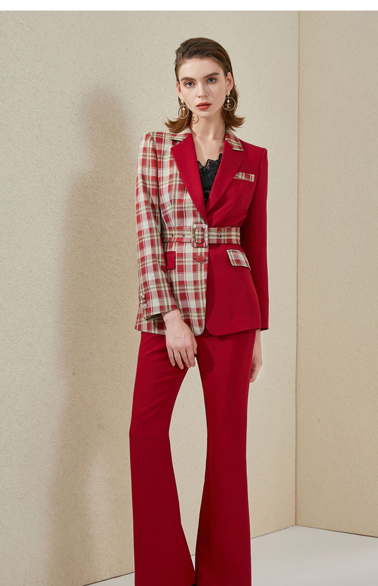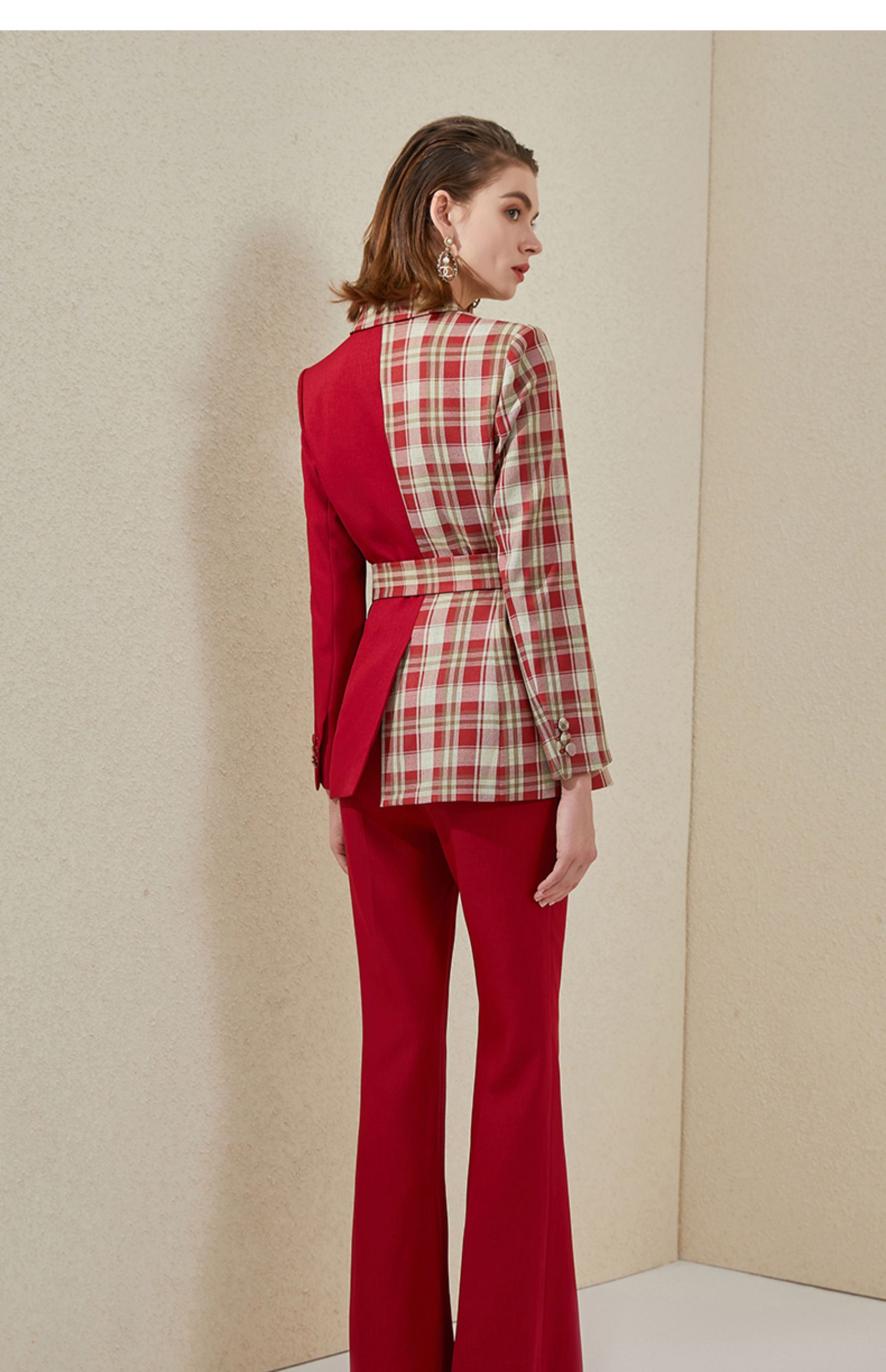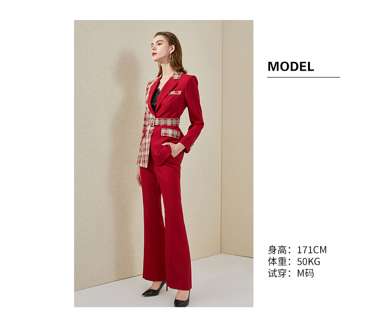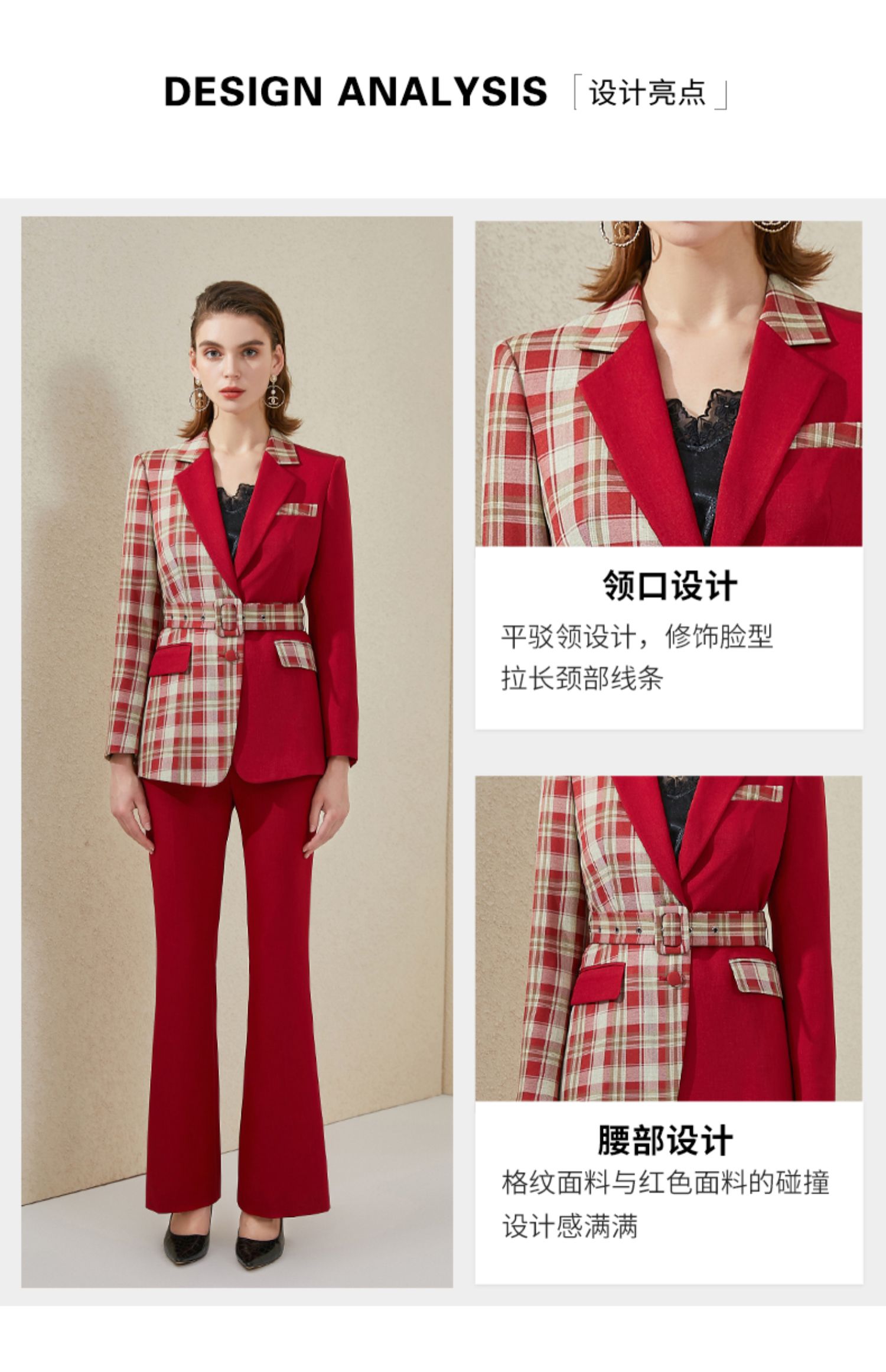 IWY/高端红色格纹阔腿裤职业装秋季长袖新款宴会主持上镜总裁西装套装 213184C1+P3
