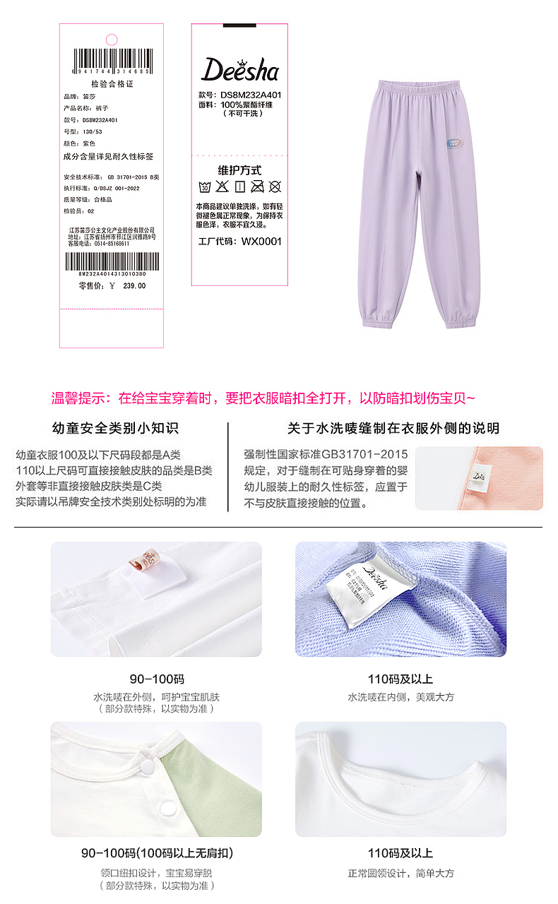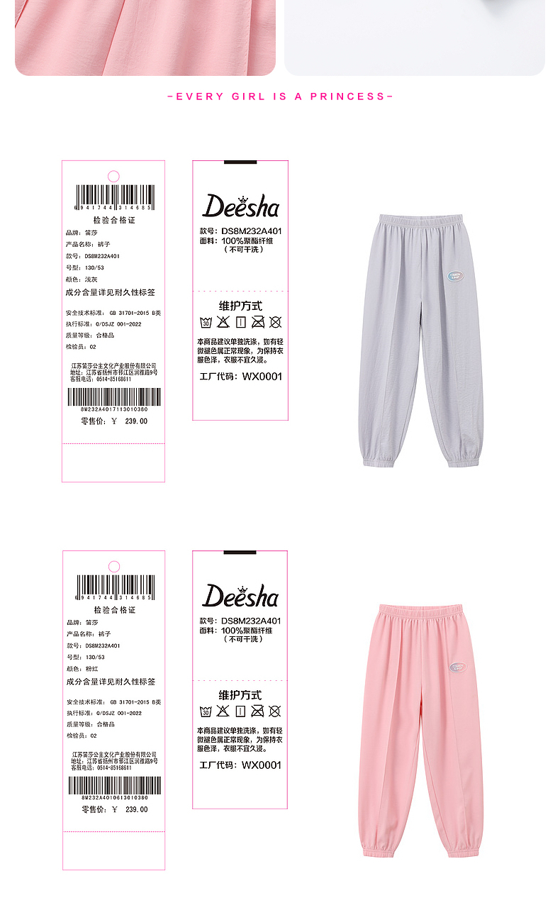 笛莎Deesha 2026年夏季新款中童女童休闲直筒裤裤子