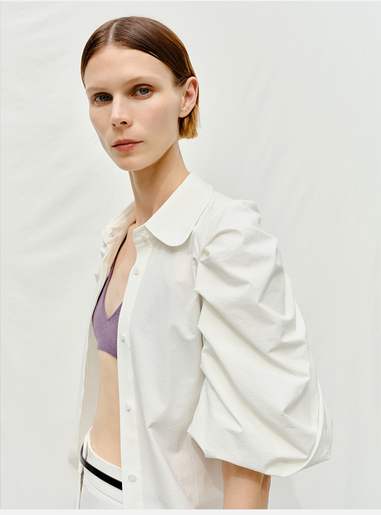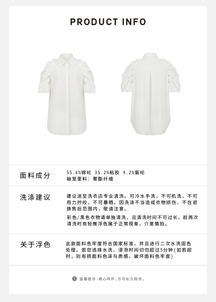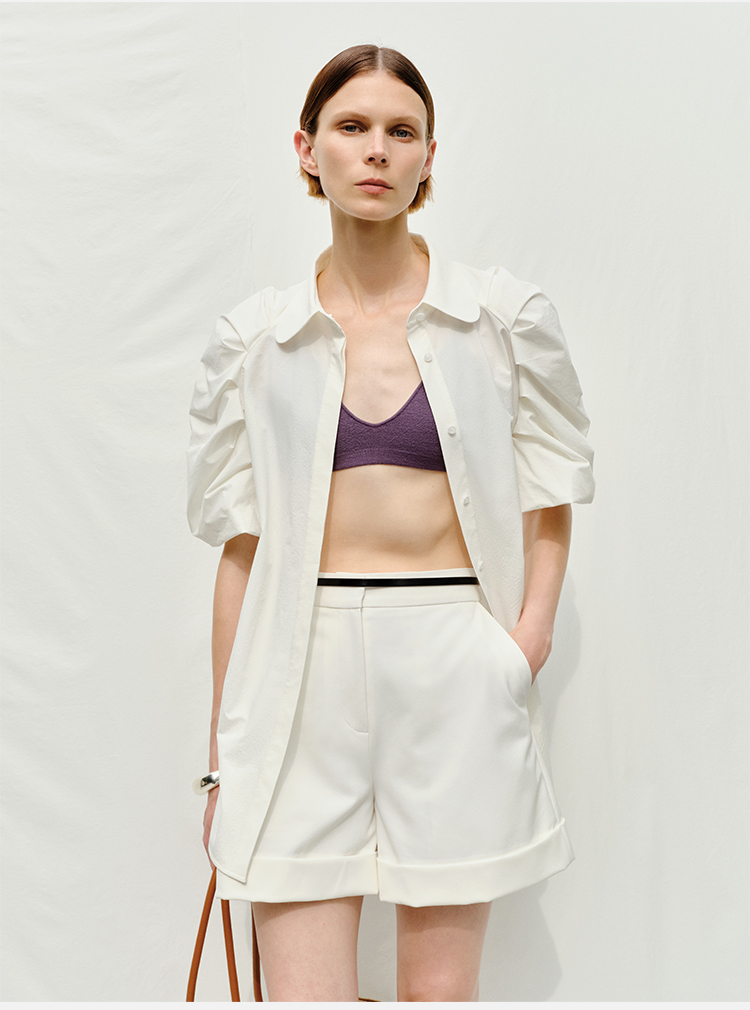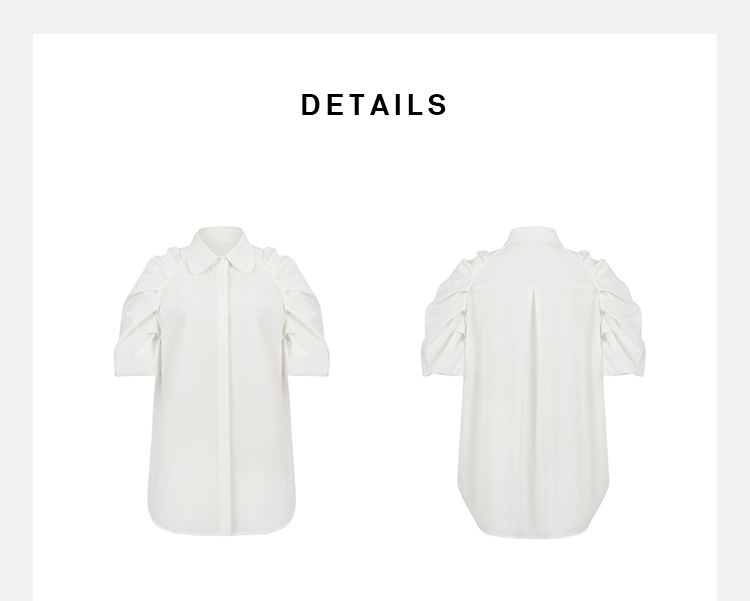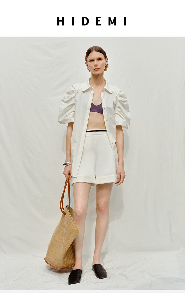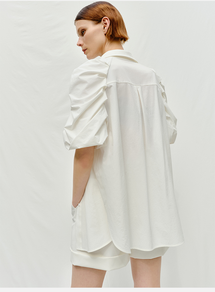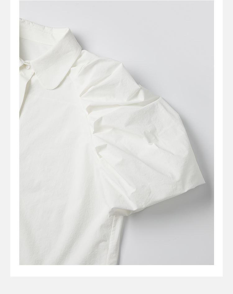 HIDEMI度假系列褶皱花苞感设计感泡泡中袖小翻领衬衫