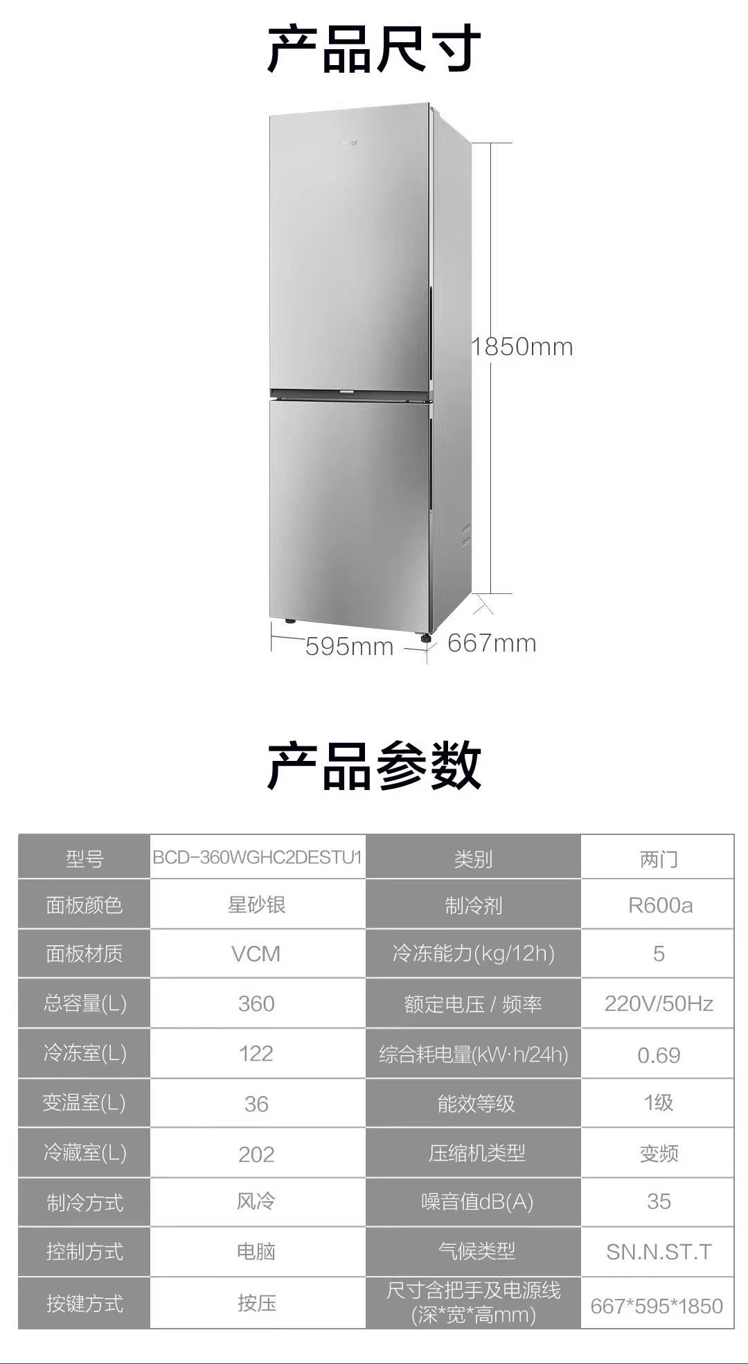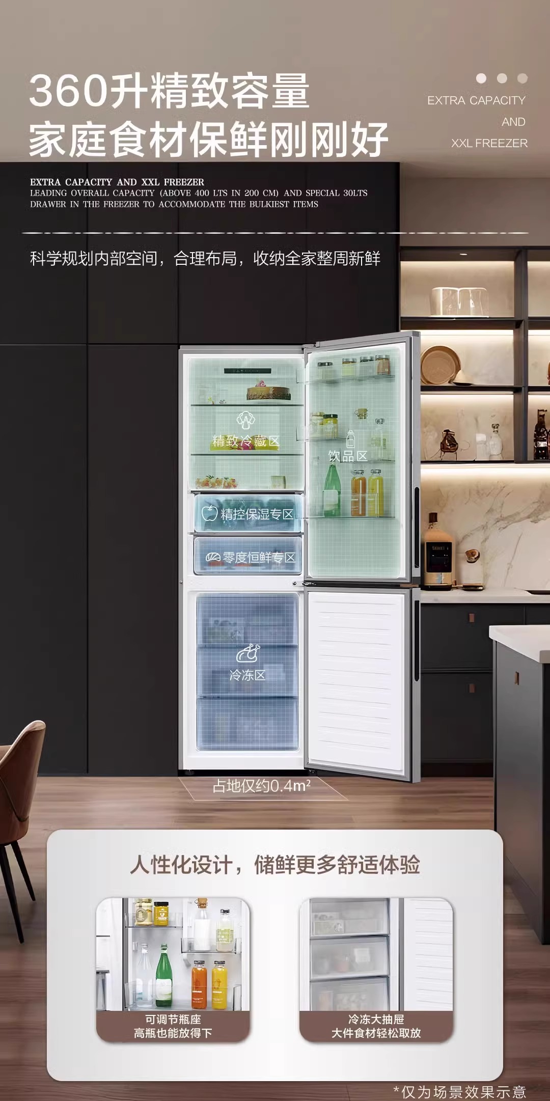 海尔(Haier)360升双门两门家用冰箱 欧式风格 零度空间 一级风冷无霜BCD-360WGHC2DESTU1