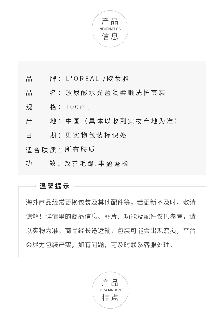 欧莱雅洗发水护发素旅行装小样玻尿酸水光盈润柔顺洗护套装100ml