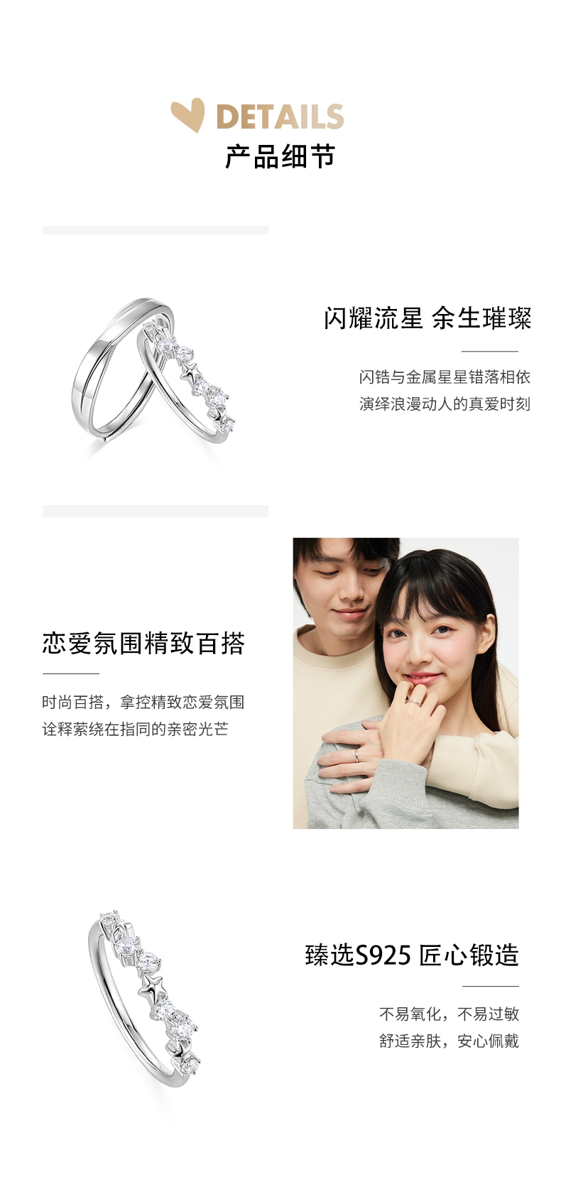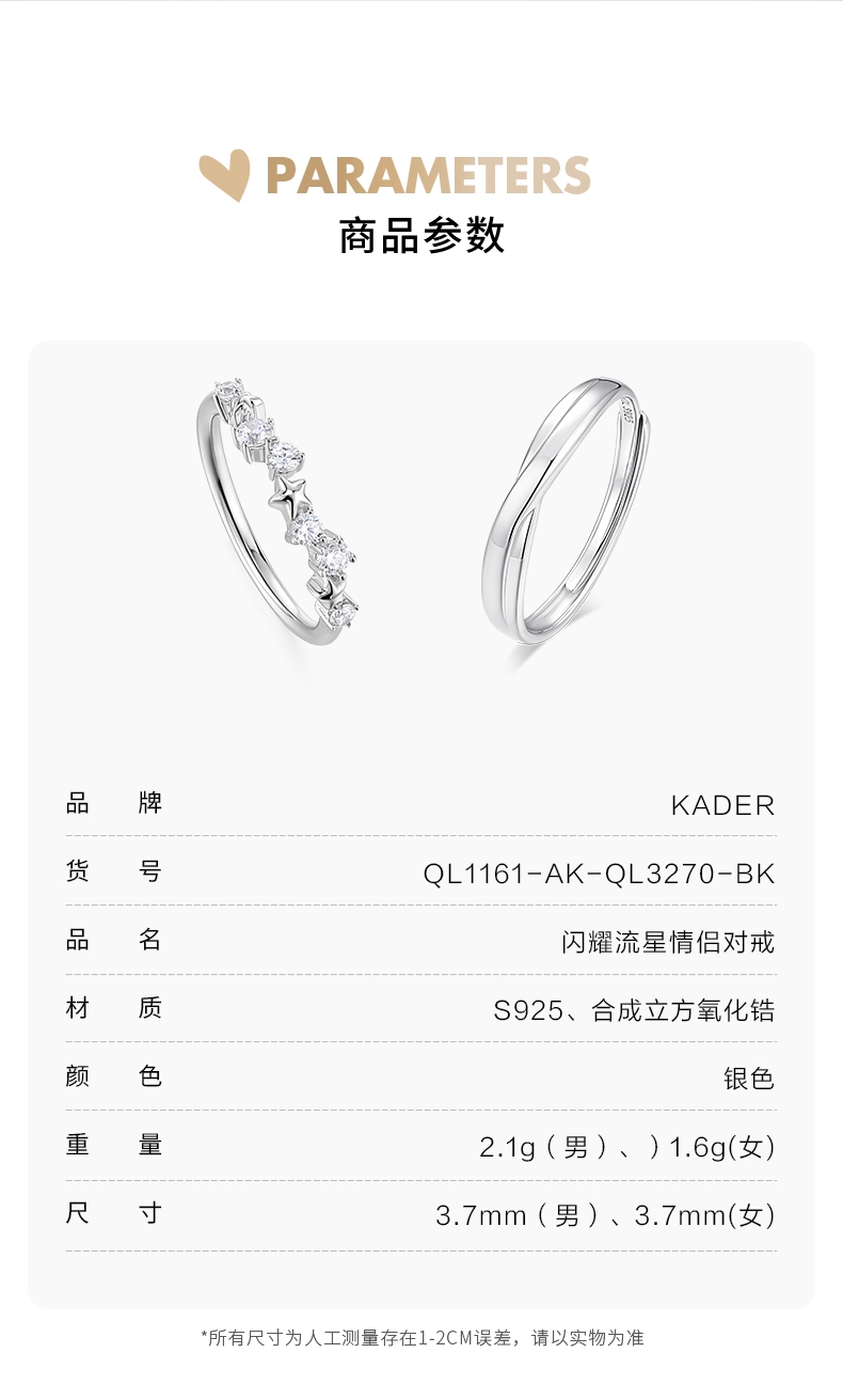 KADER卡蒂罗 闪耀流星对戒 s925银 情侣戒指女 纯银一对 小众轻奢戒指 520送礼
