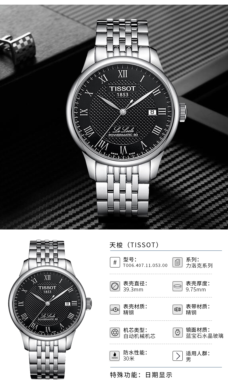 天梭TISSOT力洛克男士自动机械腕表T006.407.11.053.00新款手表