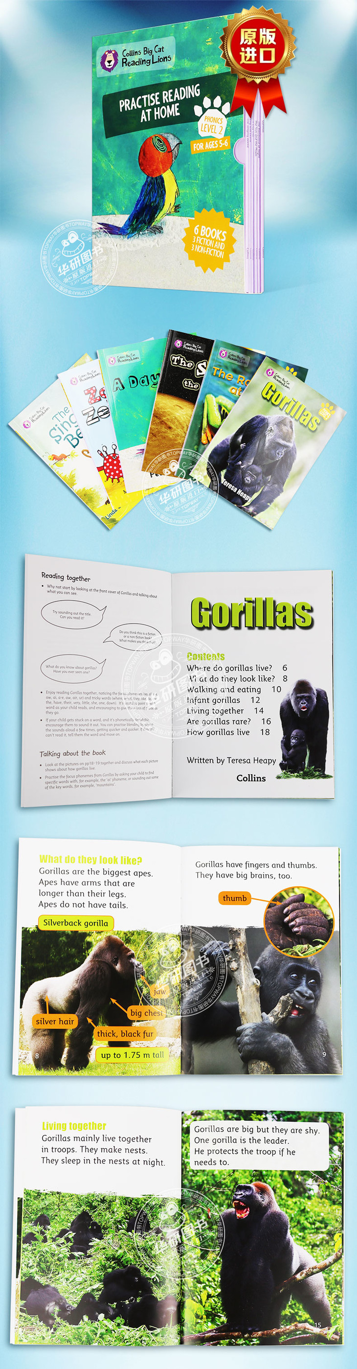 Big Cat Reading Lions-Level 2《柯林斯大猫英语阅读套装书自然拼读第2级》为自然拼读第2级,包含《太阳和月亮》《夜间的热带雨林》《大猩猩》《唱歌的甲壳虫》《佐格和斑马》和《外出的一天》6册图书。