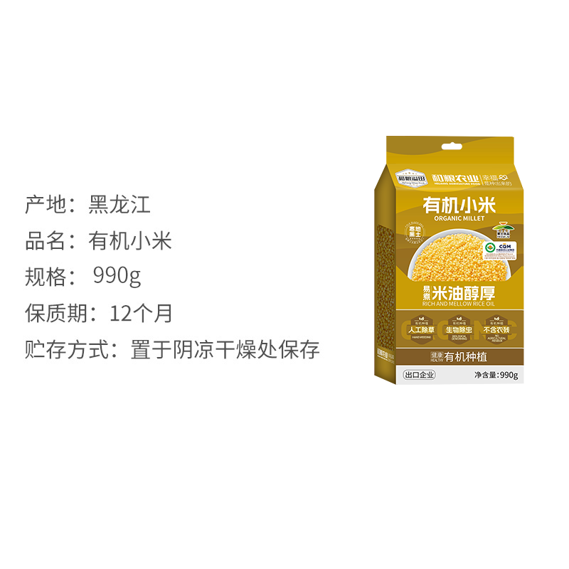 【严选】【黑龙江直发 东北黑土 有机】和粮溢田有机小米 金黄饱满 干净无杂 易煮米油浓稠有机小米990g溢田(YITASTE)溢小妹系列(厂家直发)