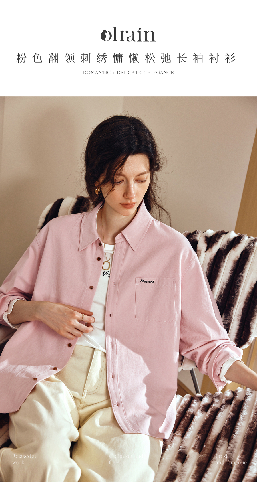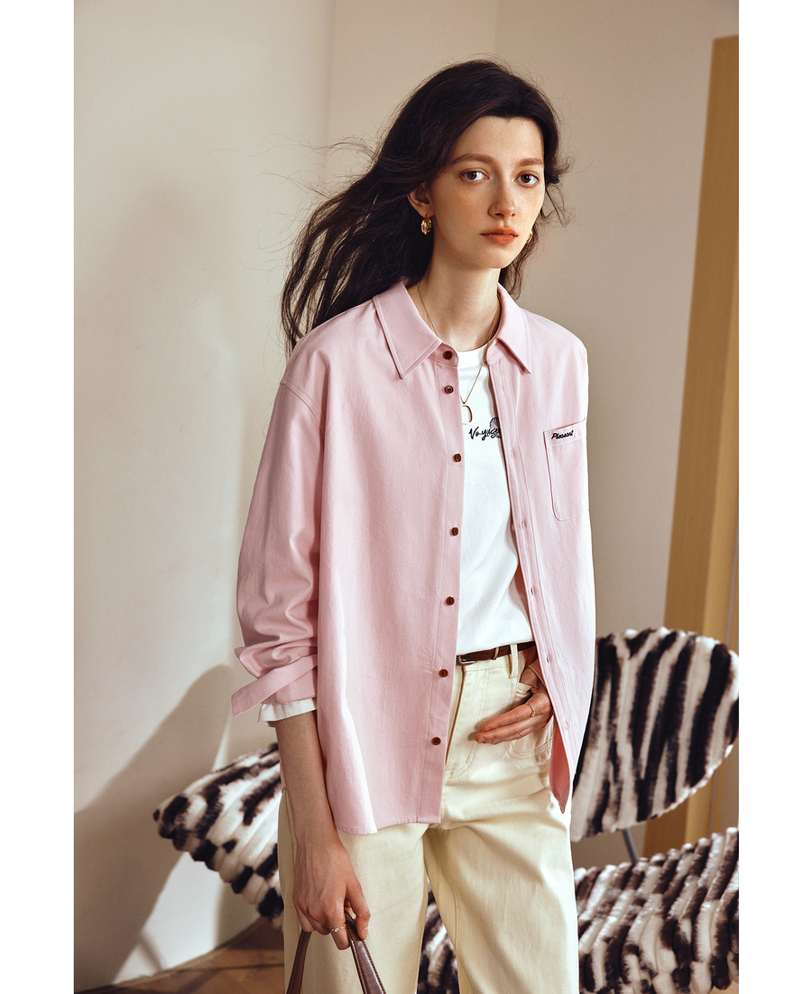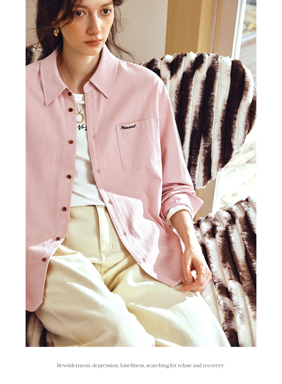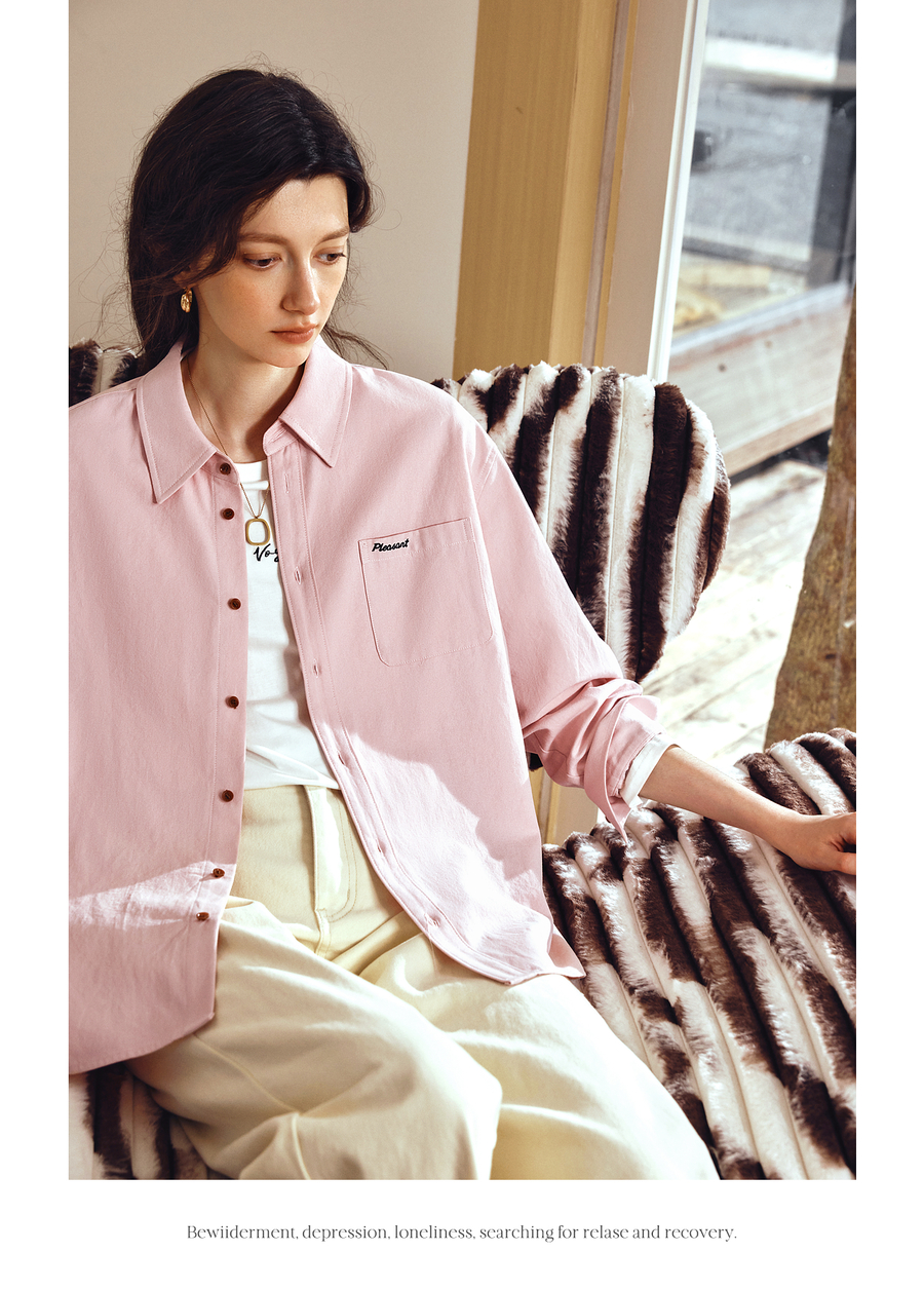 OLrain欧芮儿2025新款女秋季粉色翻领刺绣慵懒松弛通勤长袖衬衫