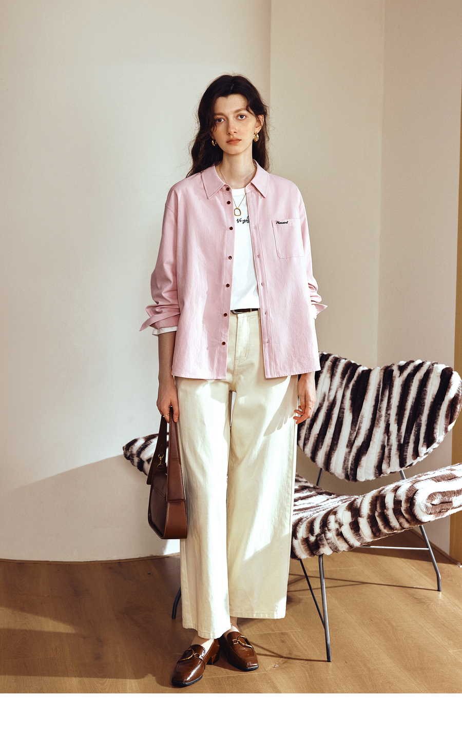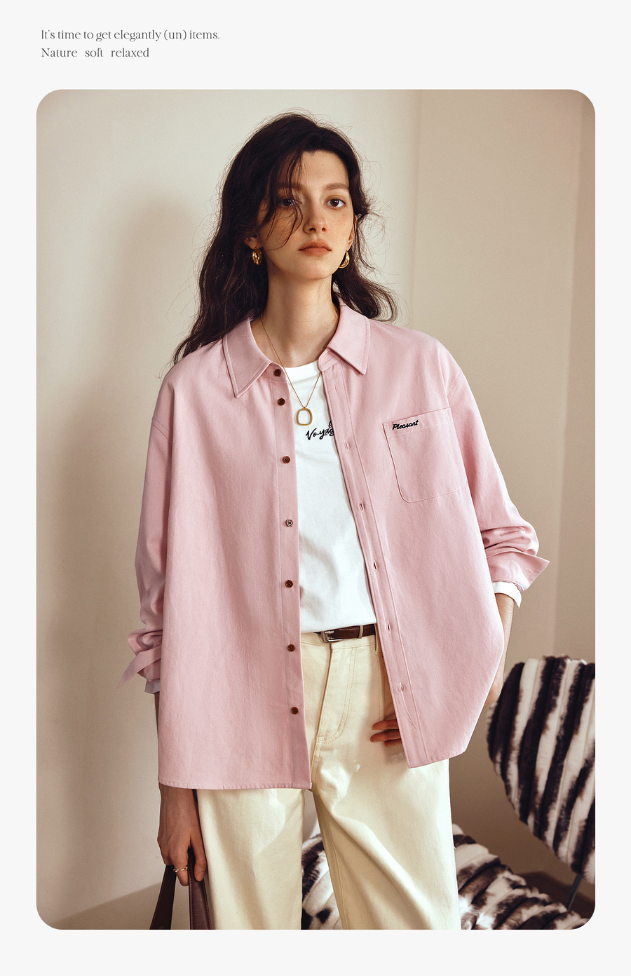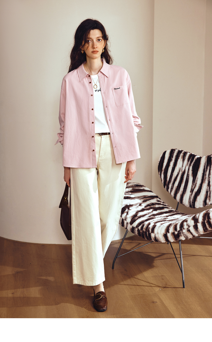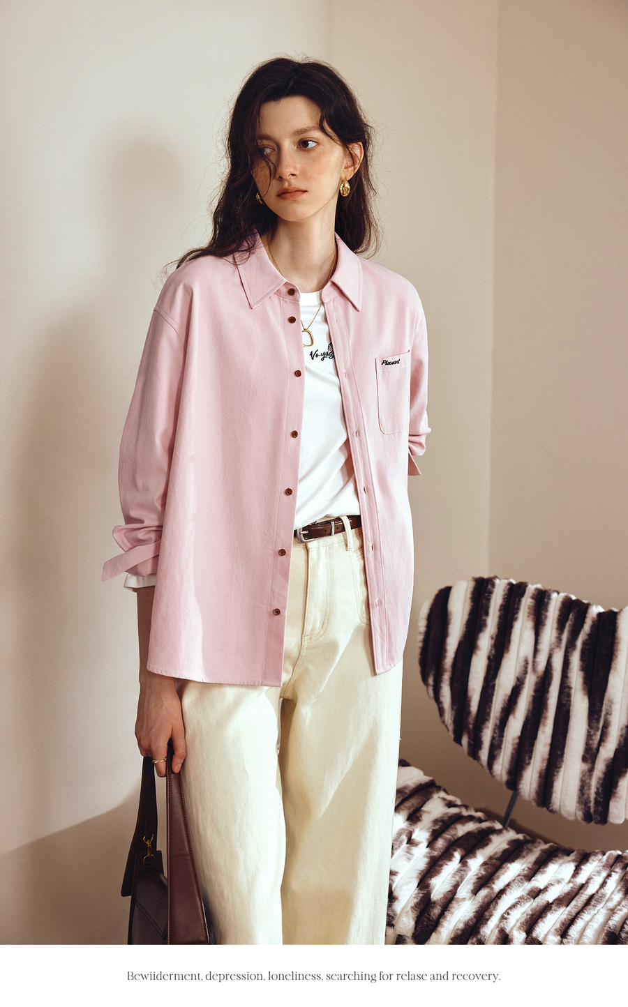 OLrain欧芮儿2025新款女秋季粉色翻领刺绣慵懒松弛通勤长袖衬衫