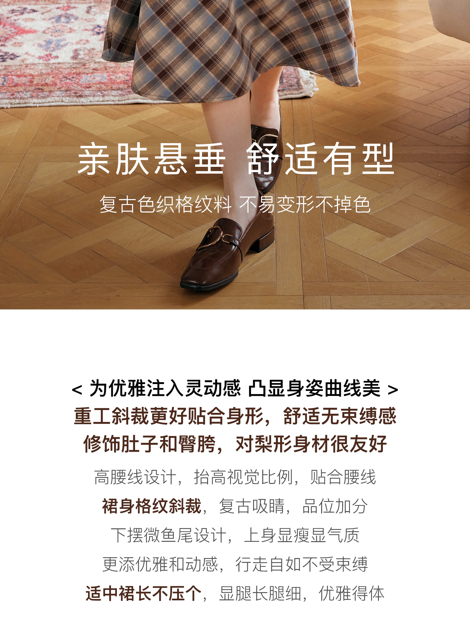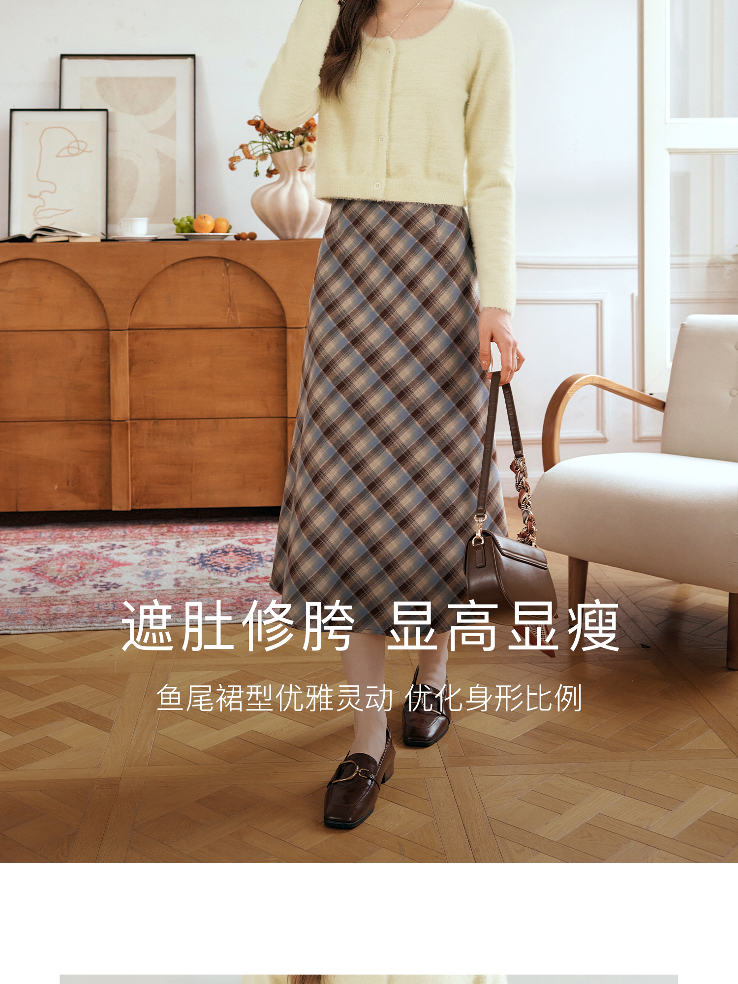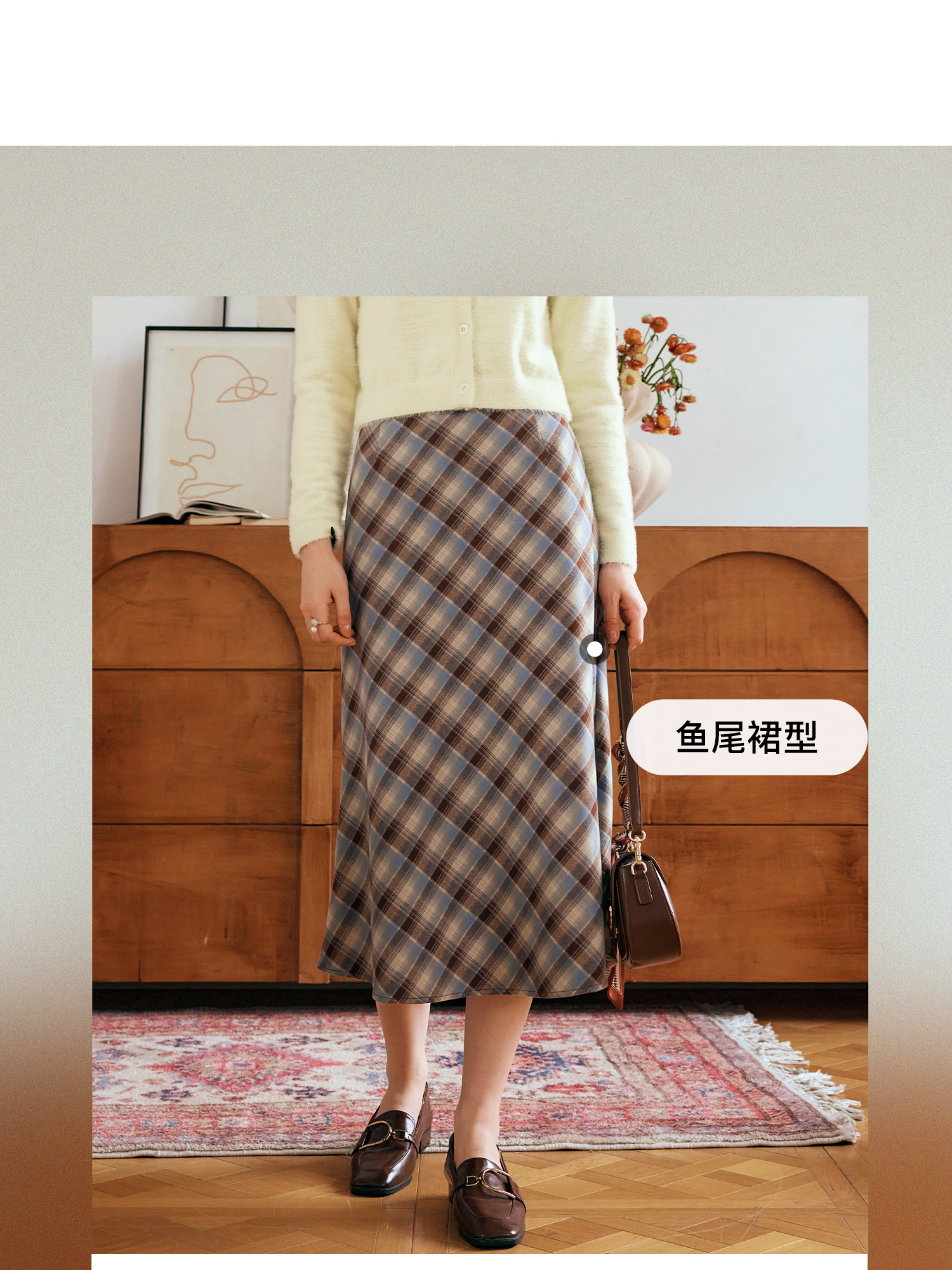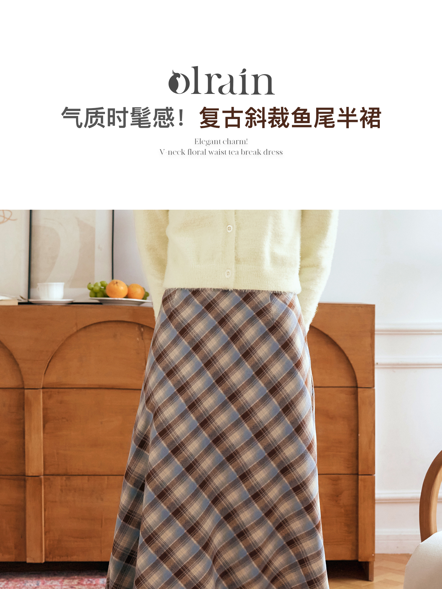 OLrain欧芮儿格纹半身裙女秋季2024年新款复古通勤斜裁鱼尾半裙
