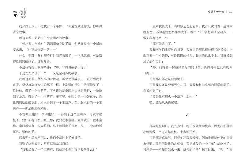 你们也许要问:“什么?宝葫芦?就是传说故事里的那种宝葫芦吗?”不错,正是那种宝葫芦。可是我要声明:我并不是什么神仙,也不是什么妖怪。我和你们一样,是一个平平常常的普通人。你们瞧瞧,我是一个少先队员,我也和你们一样,很爱听故事。