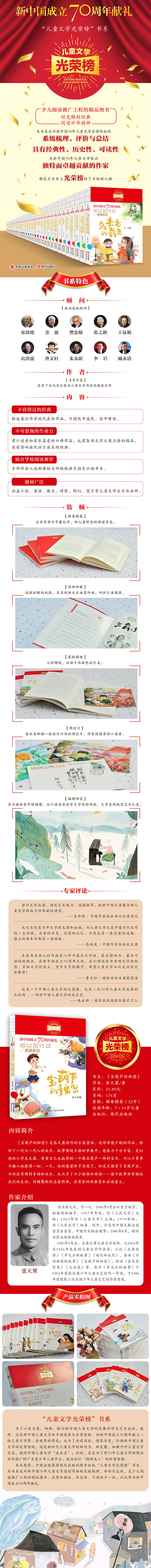 本套书系收入的作品是70年中具文学性、具影响力、具可读性的精品。在新中国成立70周年之际,我们借这套书重树文学的标准,重叙文学的意义,重申文学的操守,希望儿童文学从此走向坚定和繁荣!