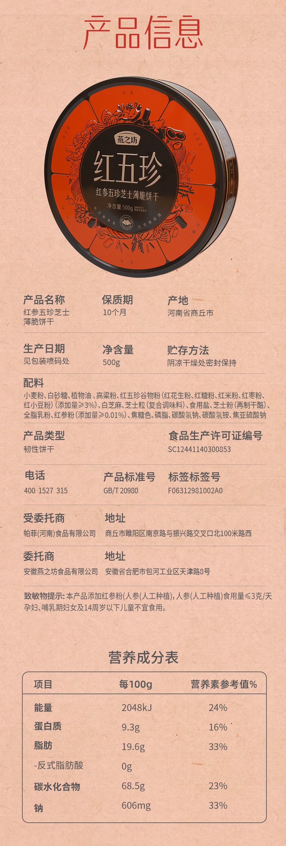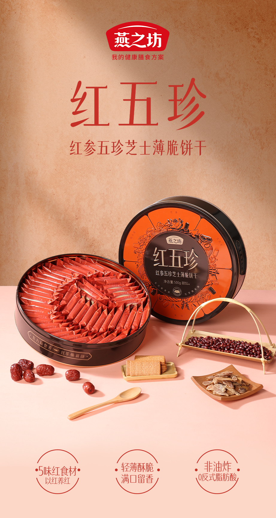 燕之坊 红参五珍芝士薄脆饼干500g (铁盒装) 轻薄酥脆 健康零食 48小时发货