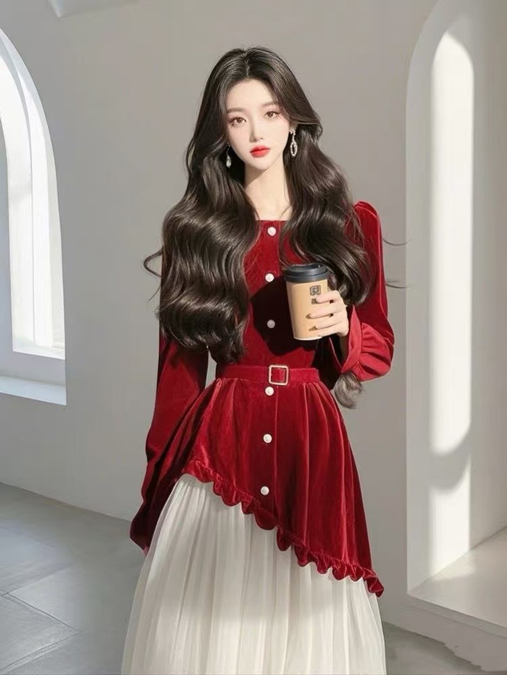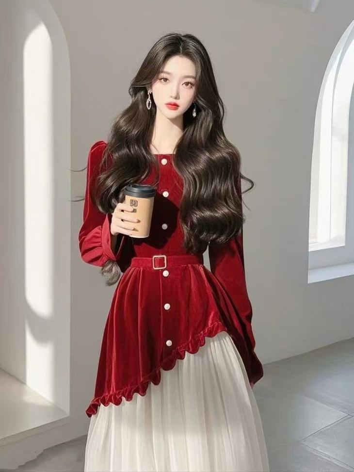 法式高级感漂亮独特气质名媛小香风红色拼接收腰连衣裙