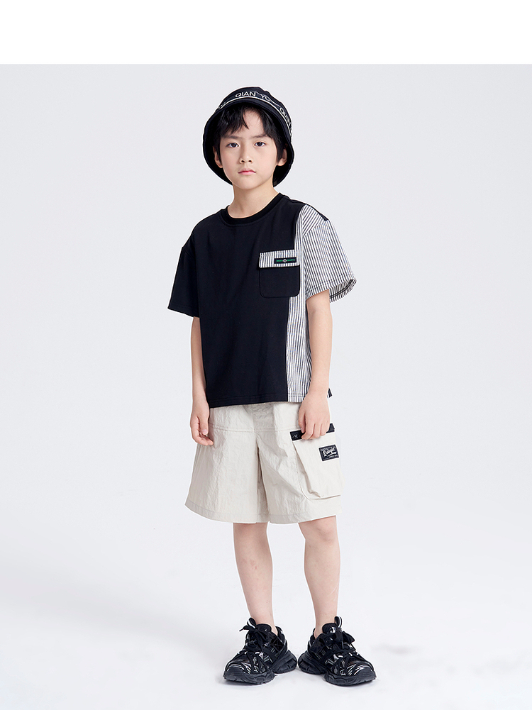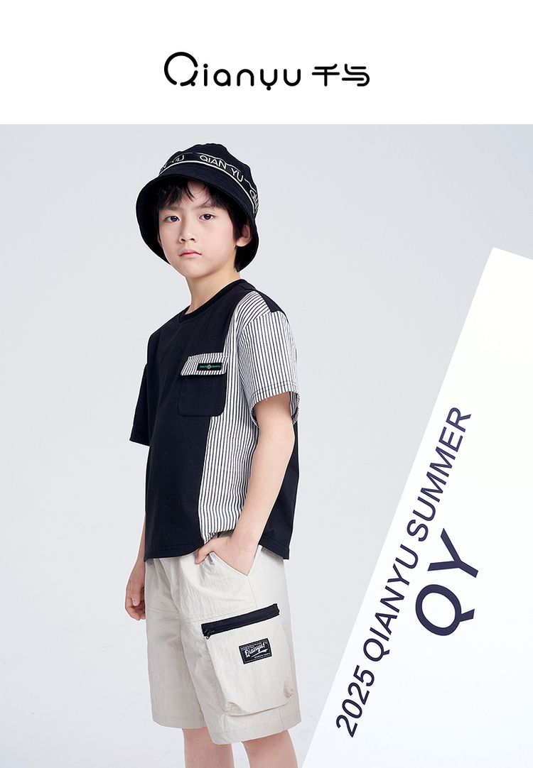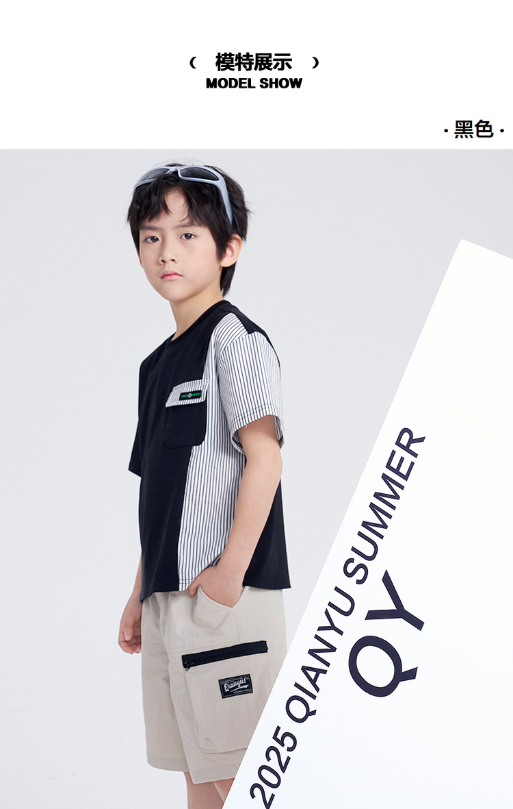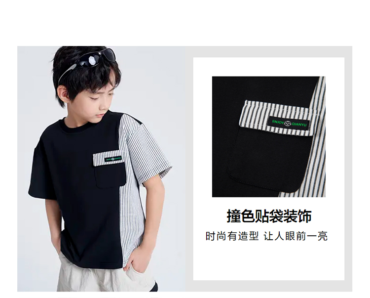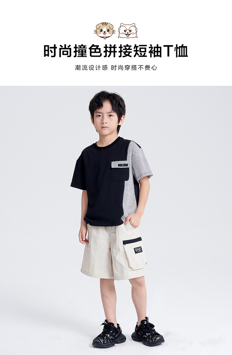 笛莎千与2025夏新款男童时尚撞色拼接短袖T恤