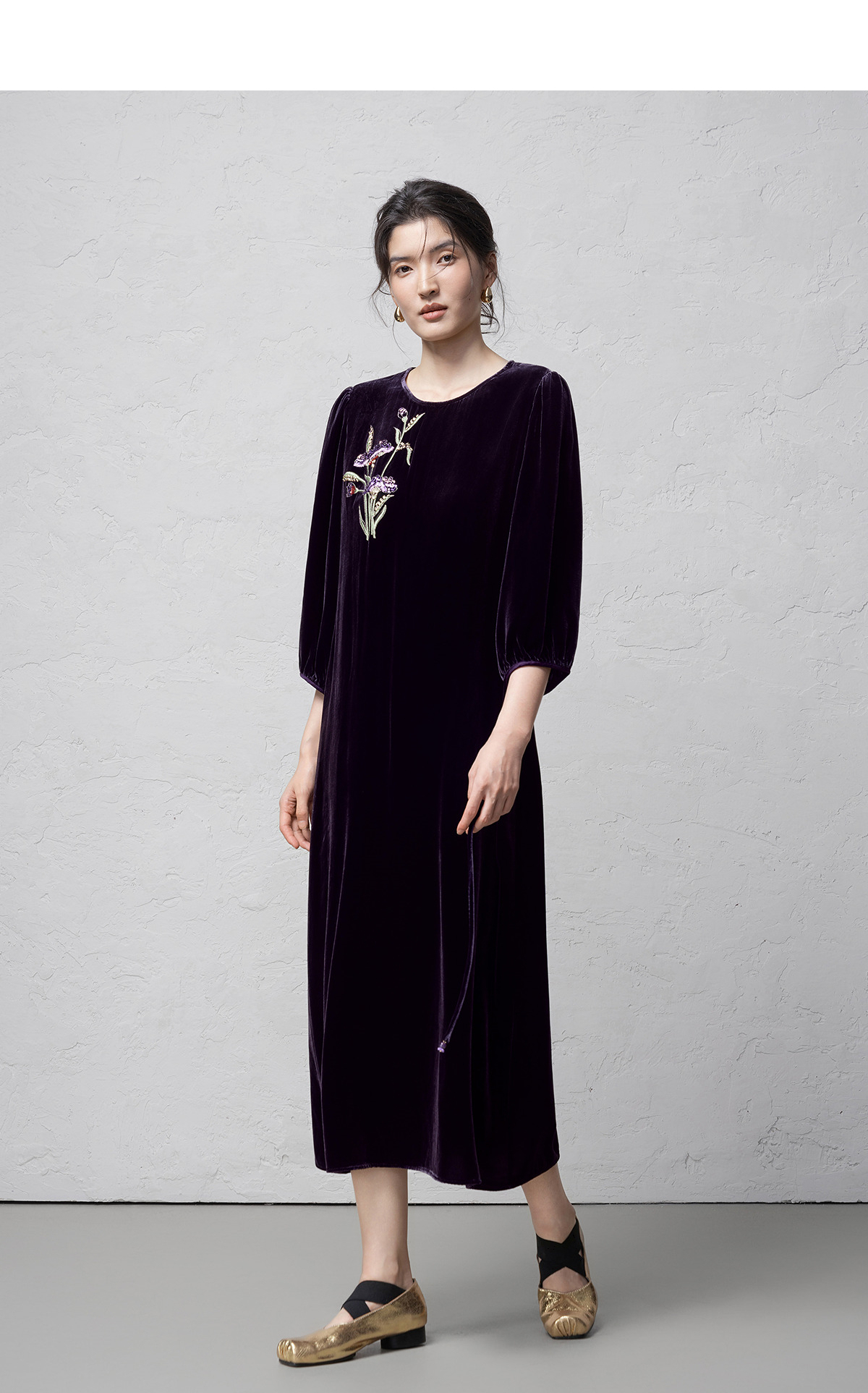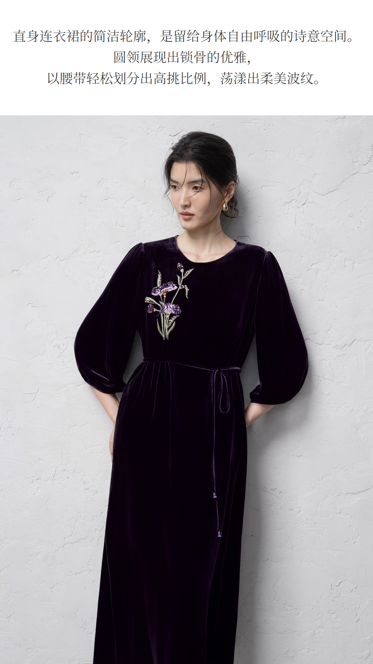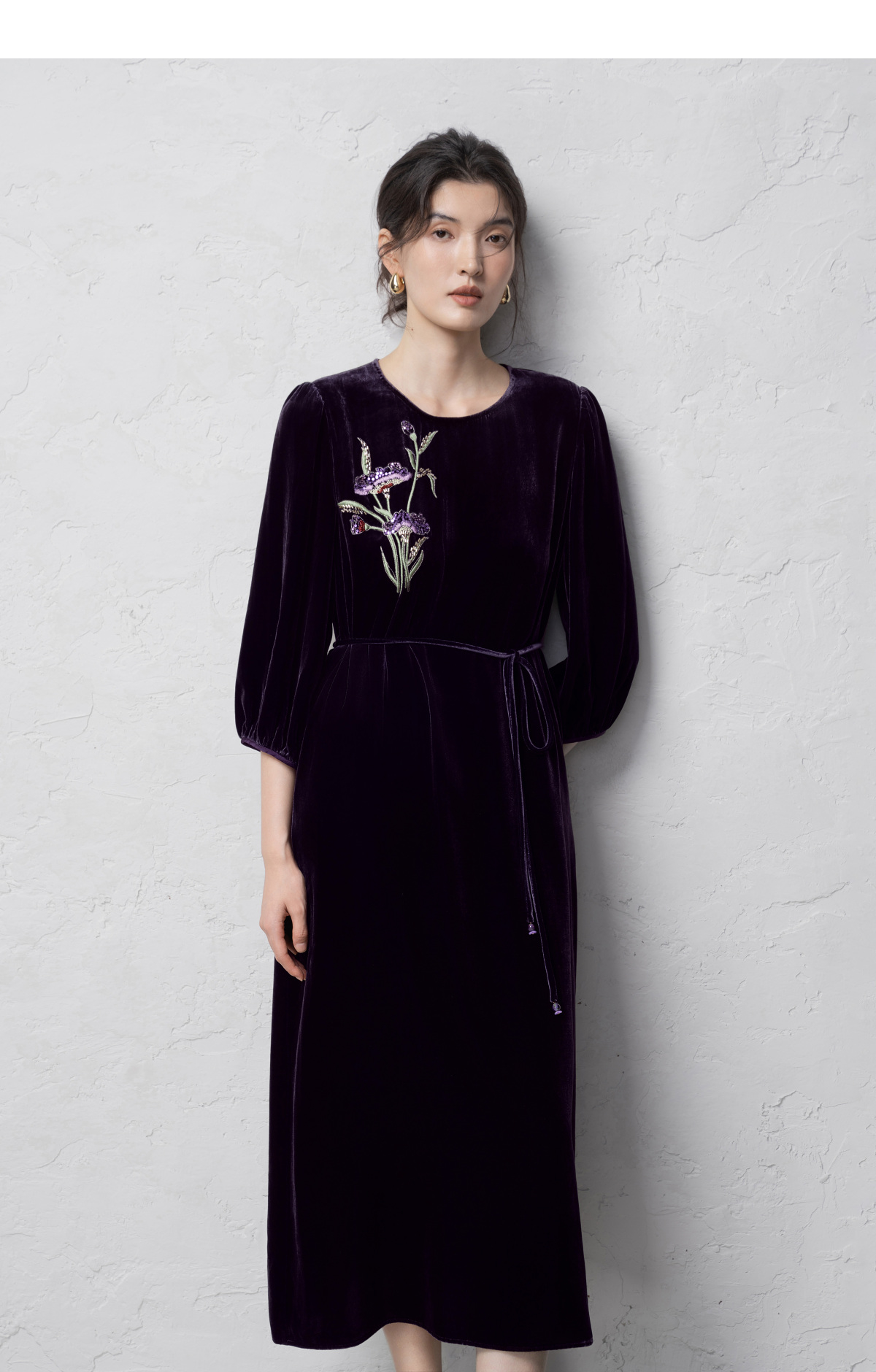 【林栖设计小店】真丝丝绒连衣裙珠片绣花宽松优雅腰带2025秋冬新款长裙女1954190