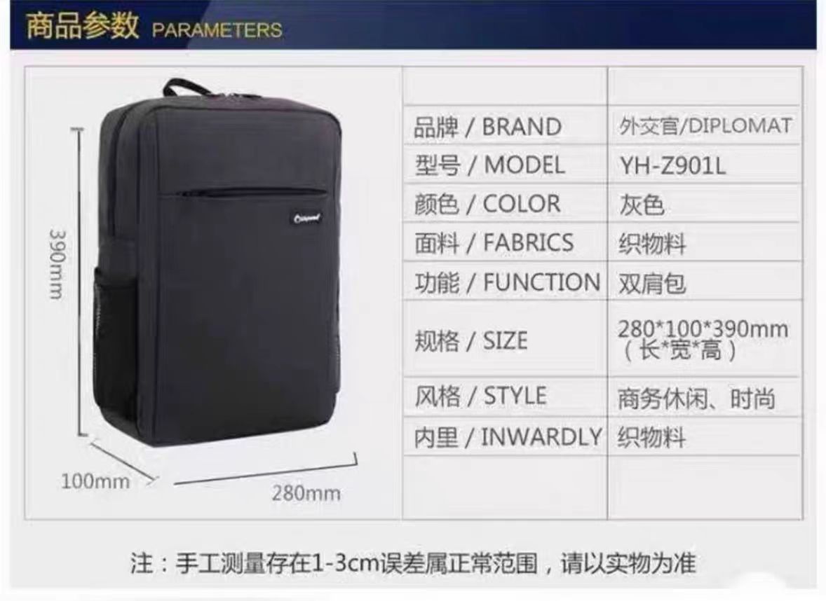 【产品名称】:【外交官/DIPLOMAT】商务休闲男女双肩背包 【规格/颜色】:280*100*390 【发货地】: 上海 【产地】:湖北 【发货快递】:中通 【加邮费地区】:新疆,西藏,青海,内蒙,宁夏+5元/单 【不发货地区】:港澳台 【发货时间】: 3-7天 【售后标准及要求】:不影响二次销售的情况下,运费自理 【是否支持7天无理由】:不影响二次销售的情况下支持7天无理由,运费自理 【拦截拒收是否需要扣发出运费】:否
