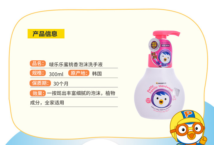 【中欧班列精选】韩国进口 啵乐乐蜜桃香泡沫洗手液300ml/瓶 HG