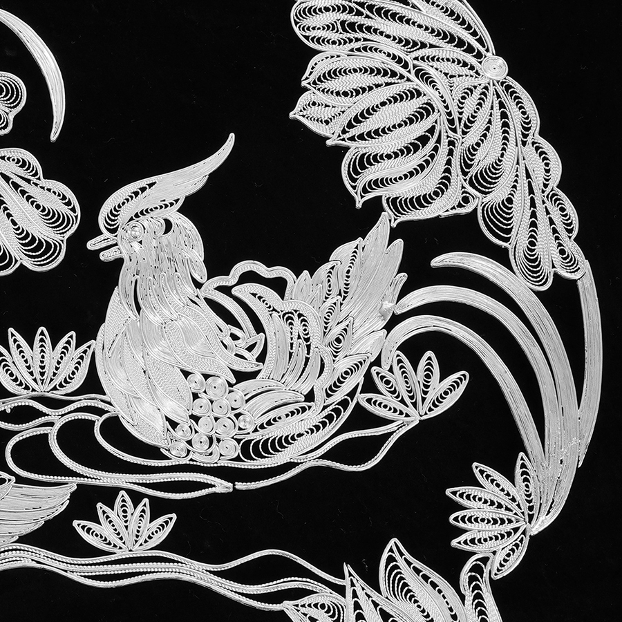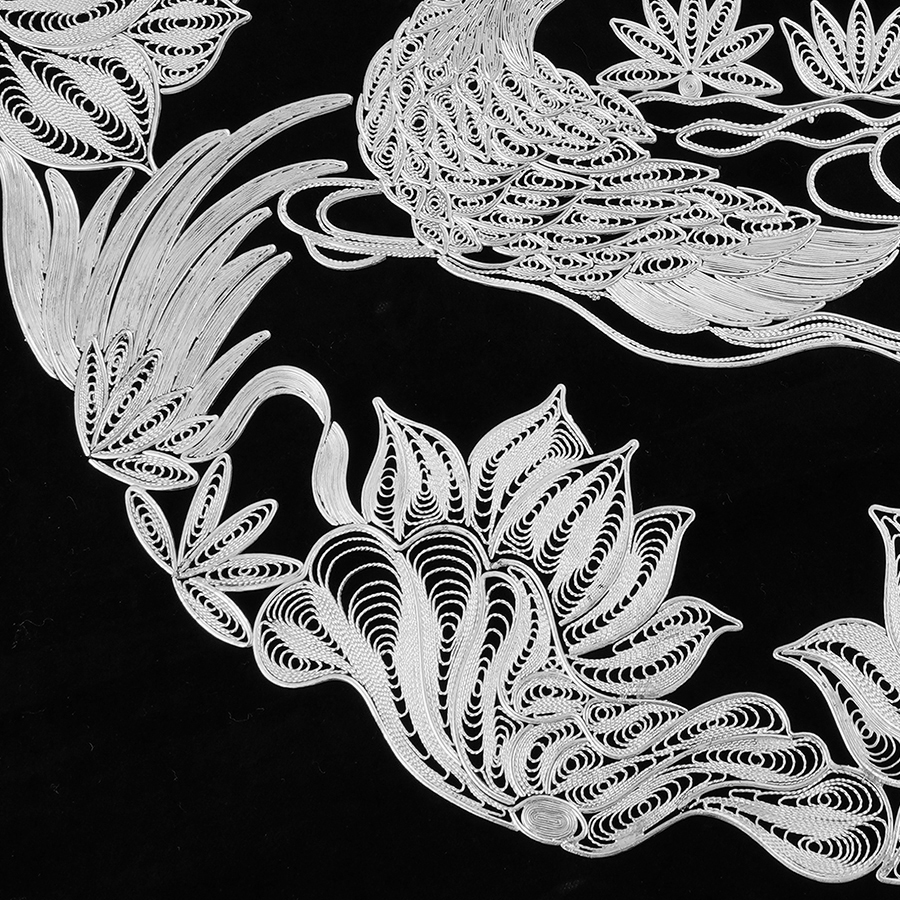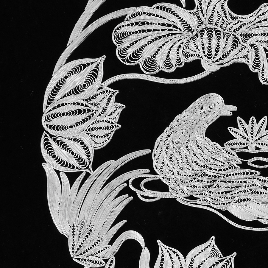 【寓意】:作品甄选纯度高达99.9%的足银为材,采用非遗银花丝工艺制作。其设计灵感源自李时珍《本草纲目》中对鸳鸯的精妙诠释:“终日并游,有宛在水中央之意也。或曰:雄鸣曰鸳,雌鸣曰鸯。”以鸳鸯作为花丝盘主体,将纤如毫发的光丝与麻花丝搭配,既展现出工艺师出神入化的工艺技巧,亦塑造出栩栩如生的动态呼应之美。莲花与莲叶巧妙点缀其间,暗喻连生贵子。鸳鸯成双成对,终身一夫一妻,其习性被引申为婚姻承诺的典范。借非遗工艺,生动诠释中华传统婚恋观,寄寓着对夫妻恩爱和鸣、白首同心的美好愿景。