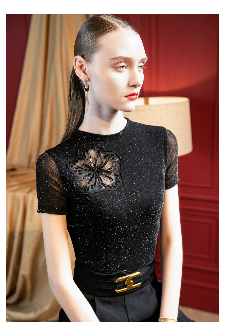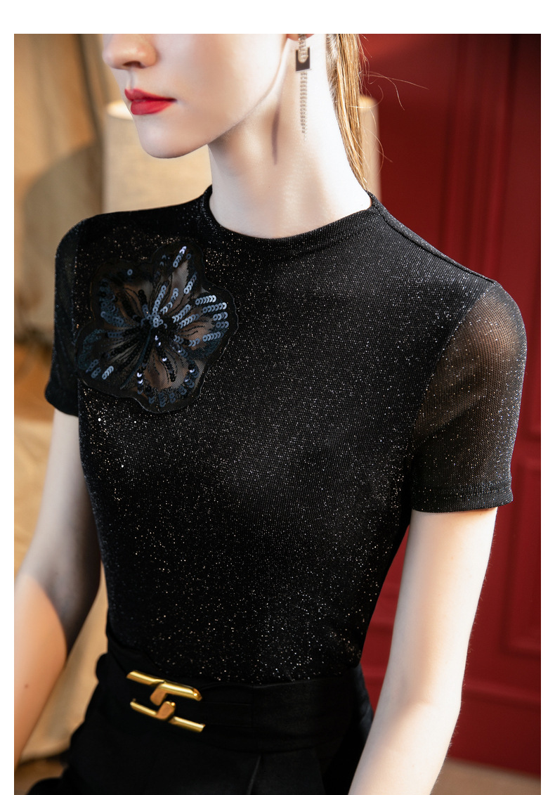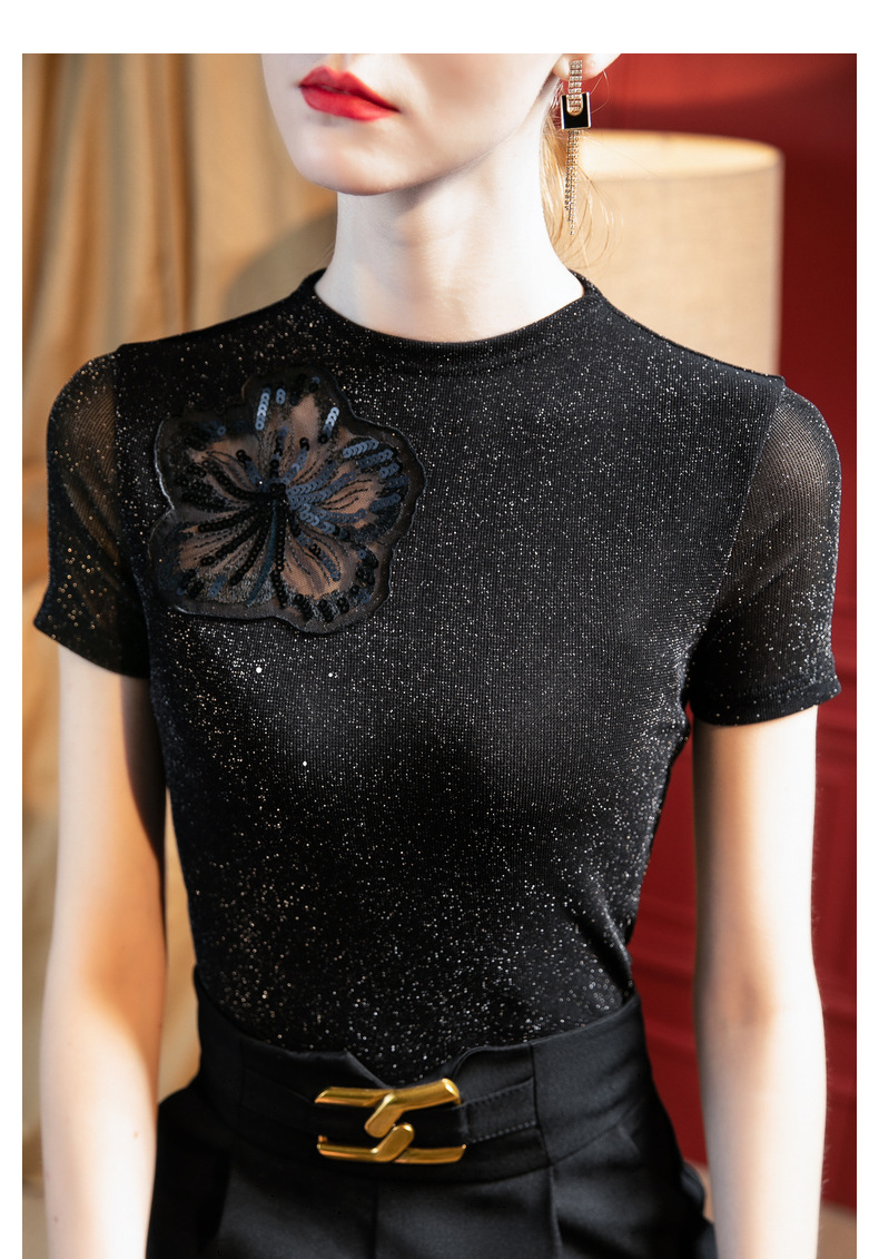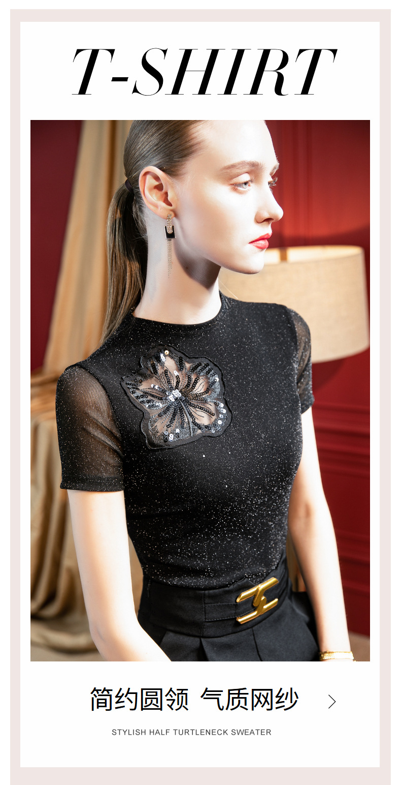 气质小高领,亮丝网纱短袖t恤刺绣拼接小衫上衣SG-T2X2495