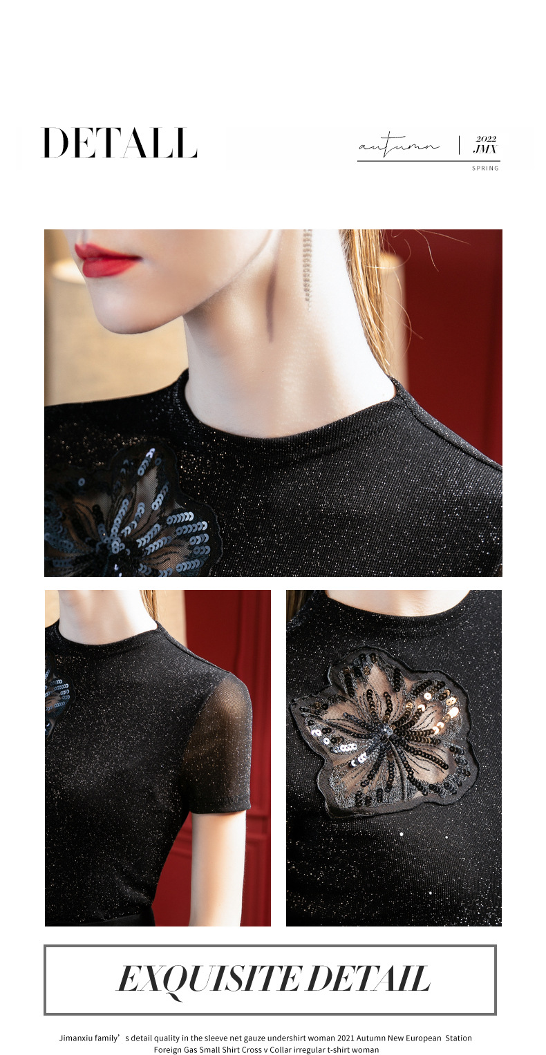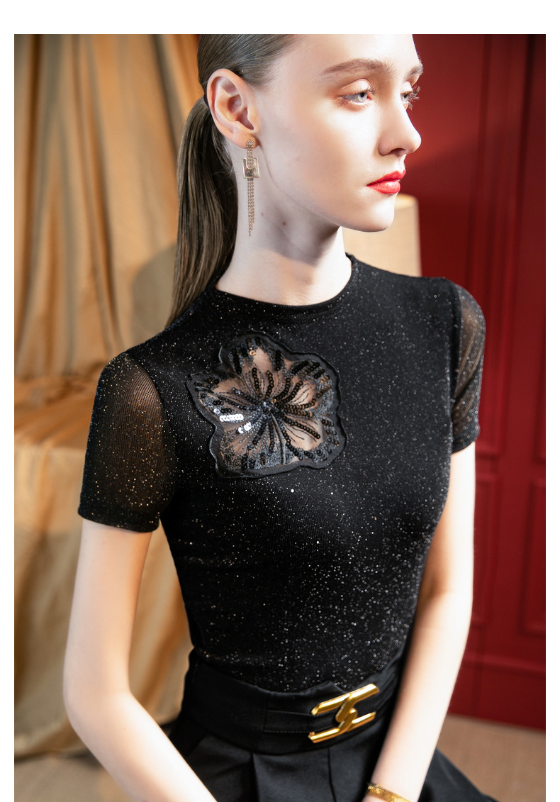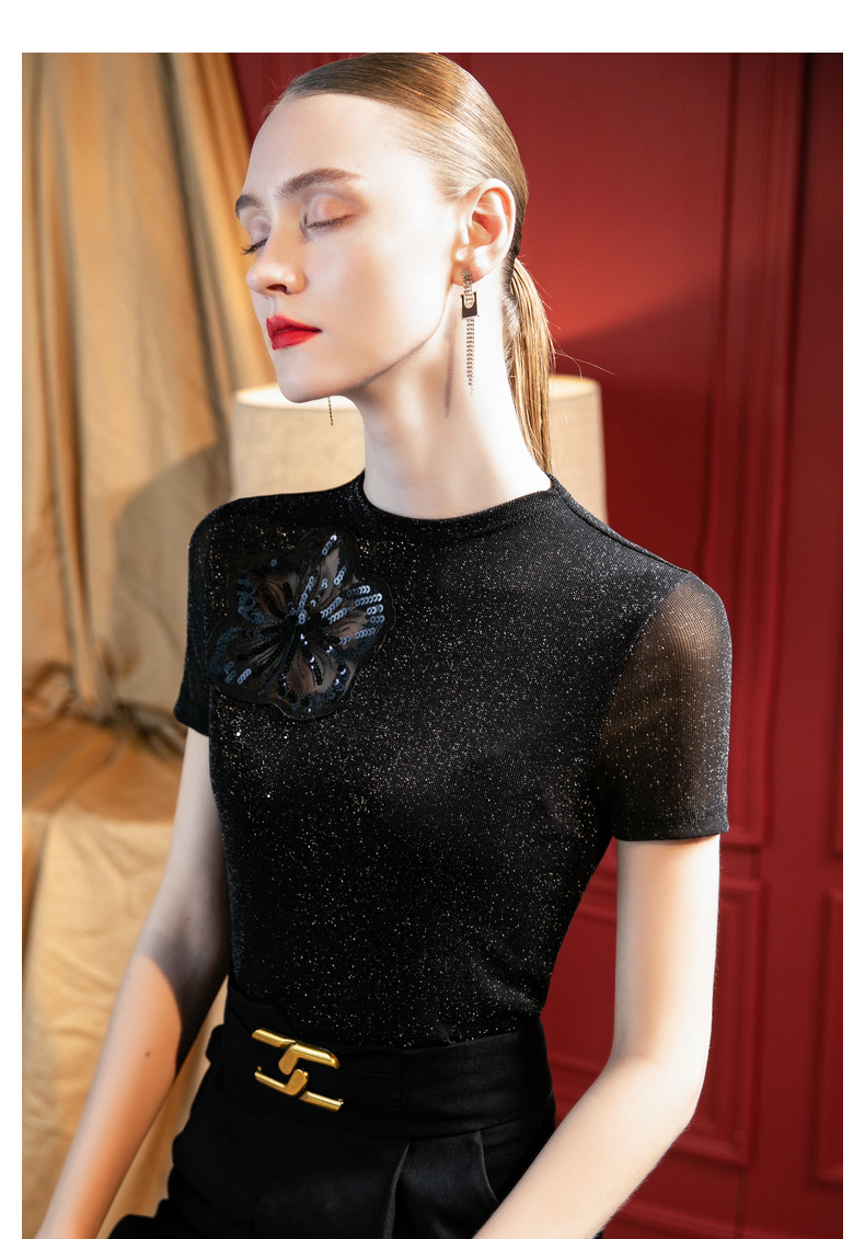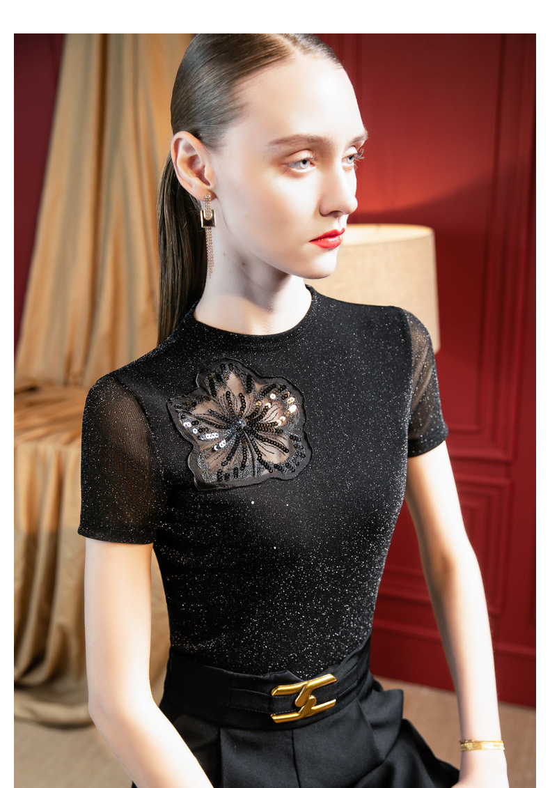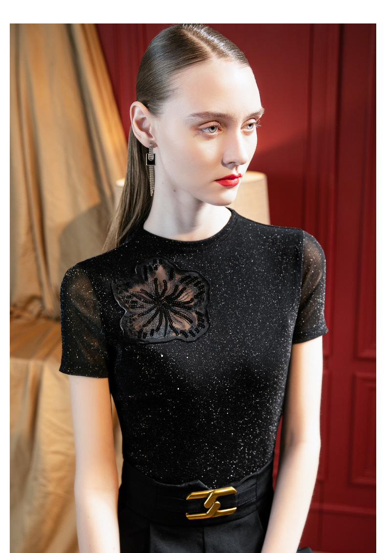 气质小高领,亮丝网纱短袖t恤刺绣拼接小衫上衣SG-T2X2495