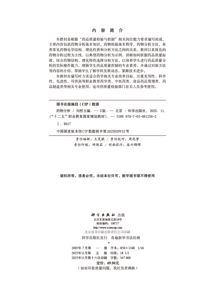 药物分析 第5五版 十二五职业教育国家规划教材 刘然 主编 供高等职业教育药学类 中医药类 药品 制造类等相关专业使用 科学出版社