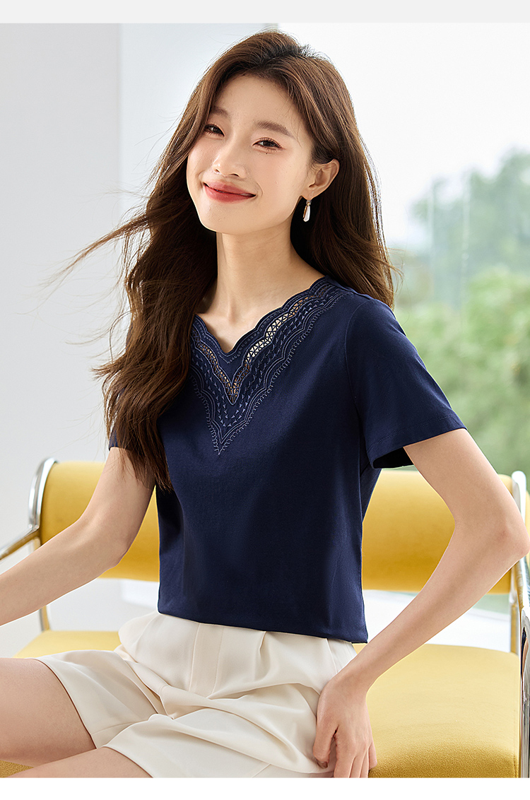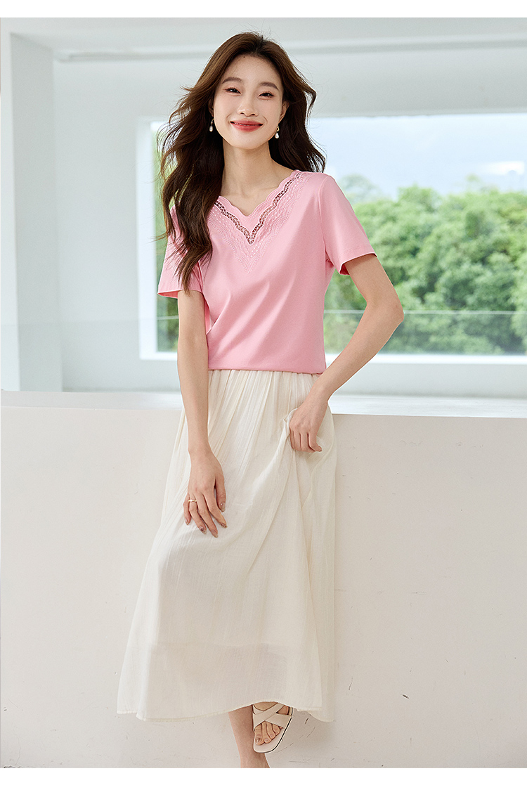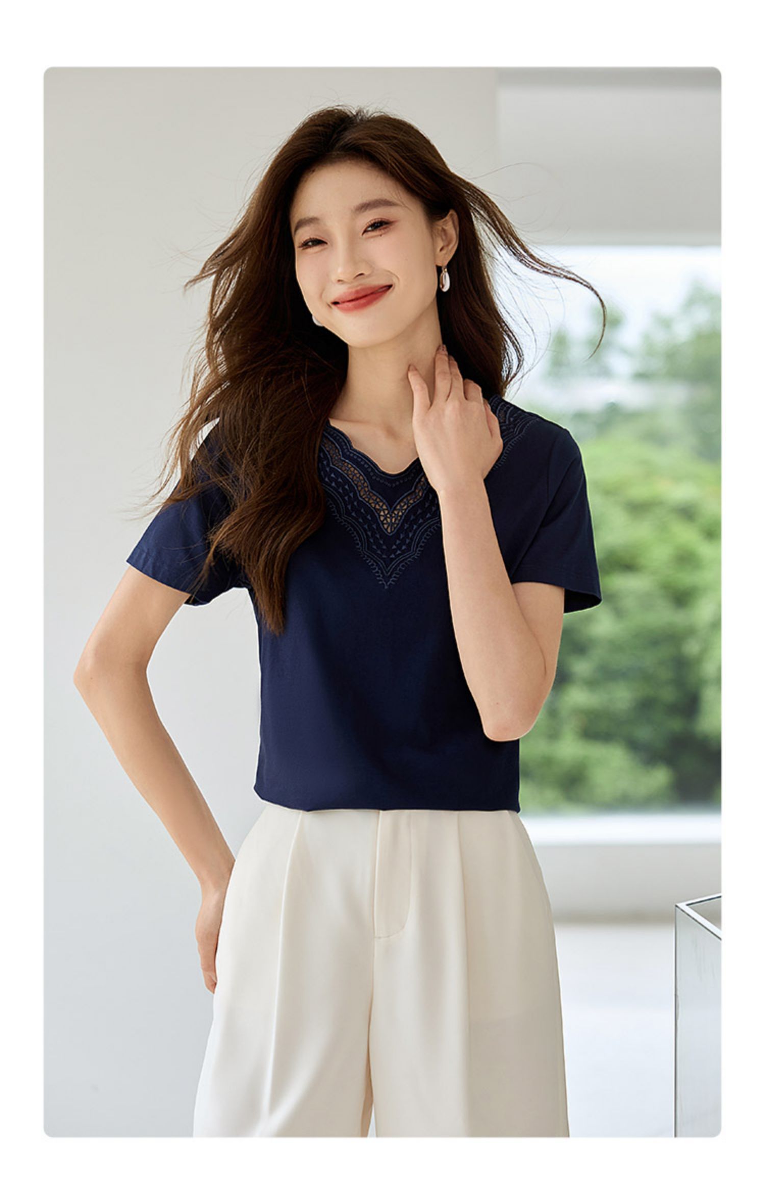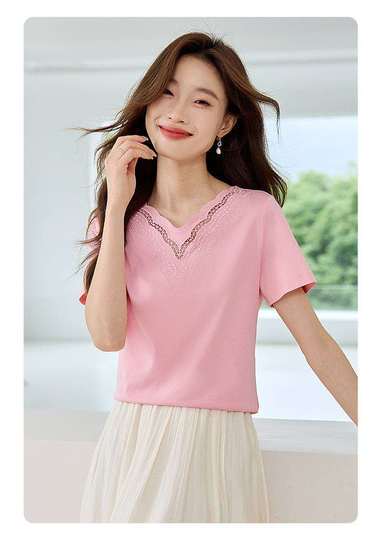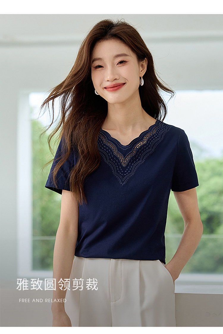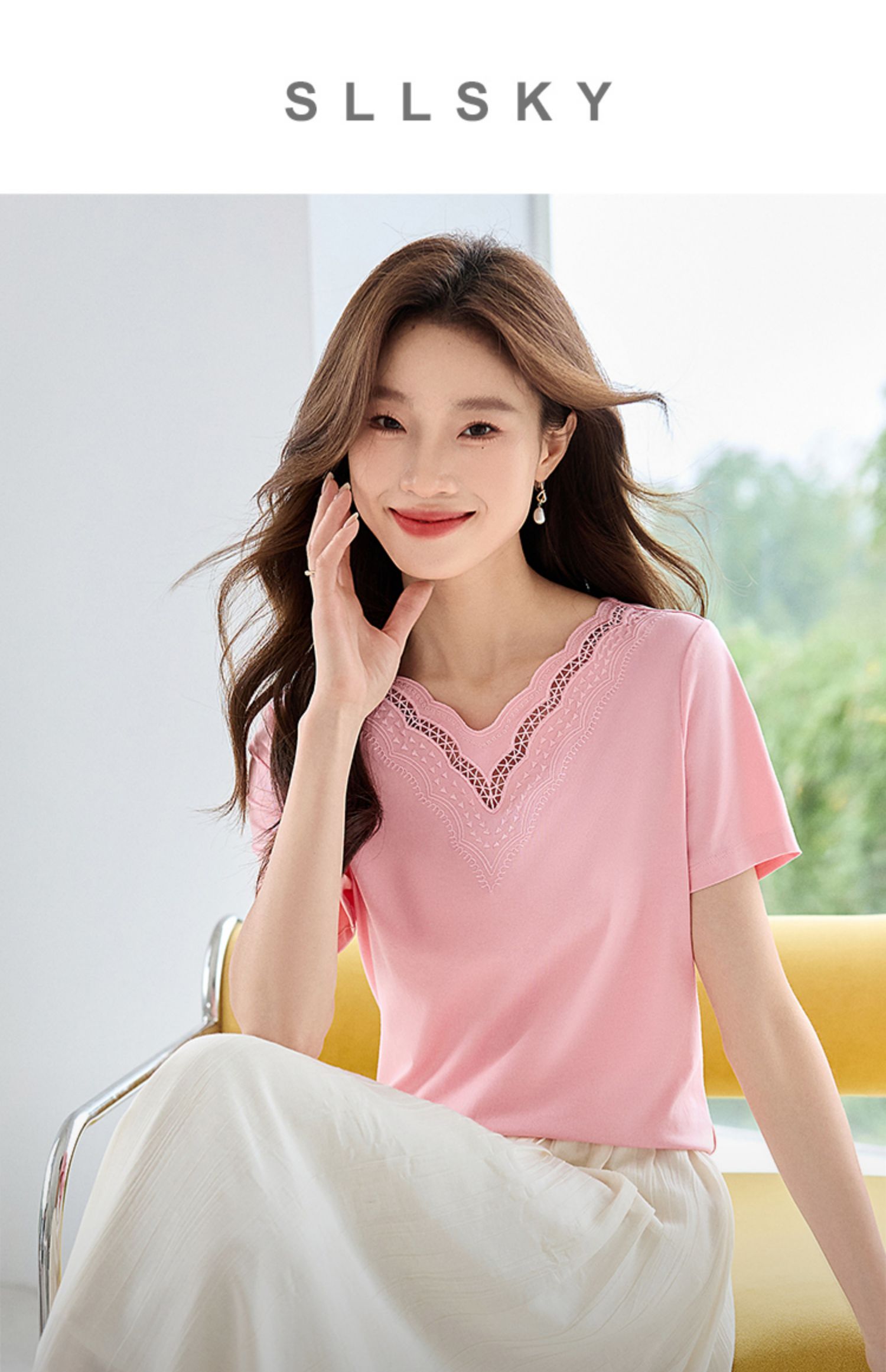 【专属特价】熙世界正肩t恤短袖2025夏季新款宽松显瘦刺绣V领百搭甜美上衣