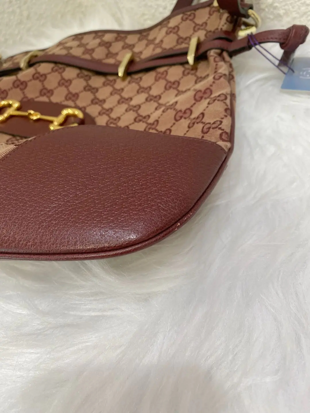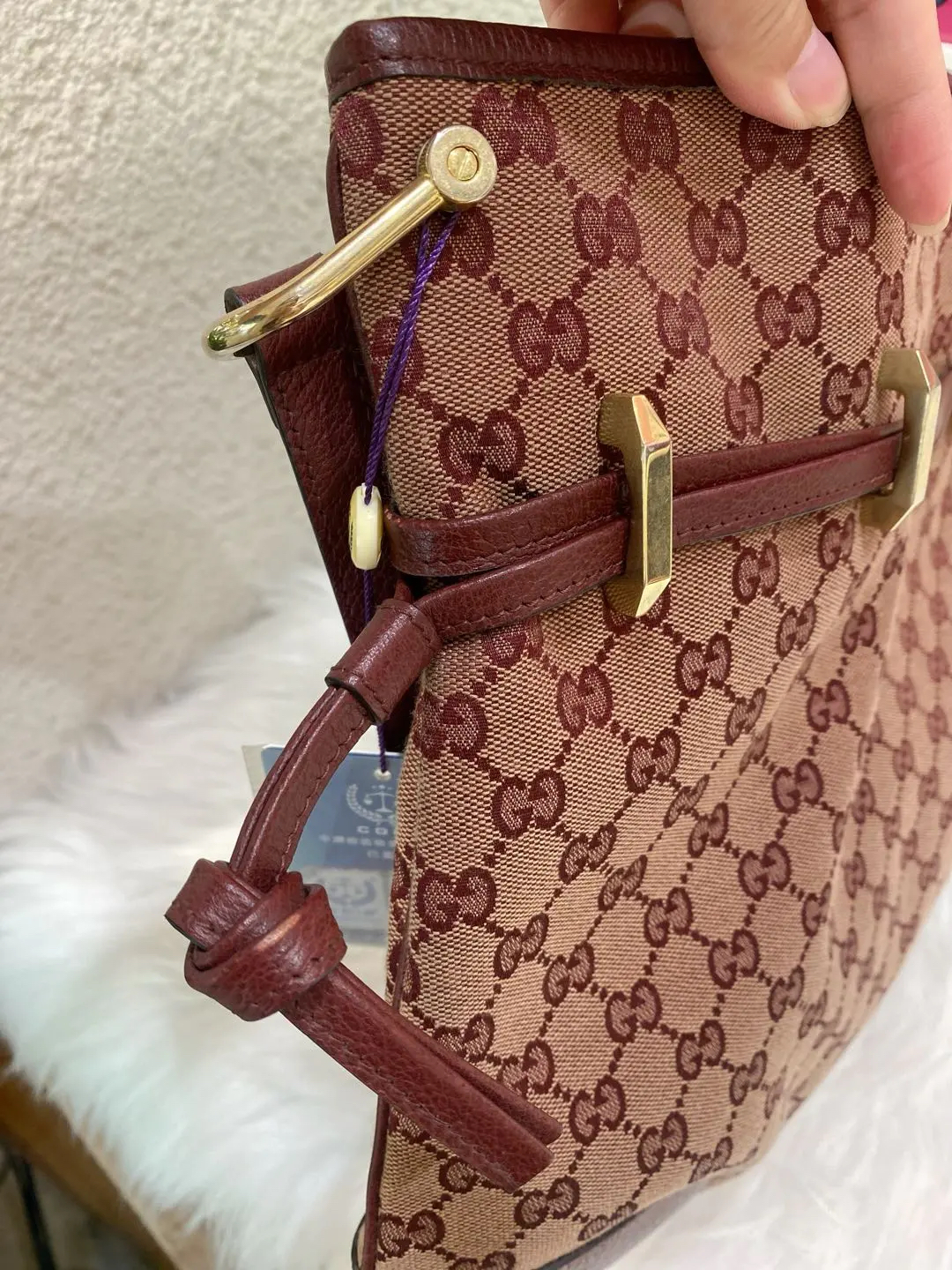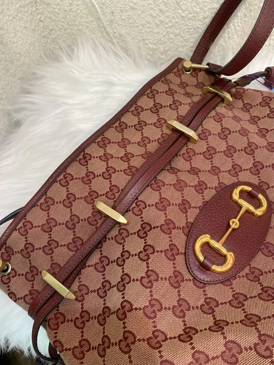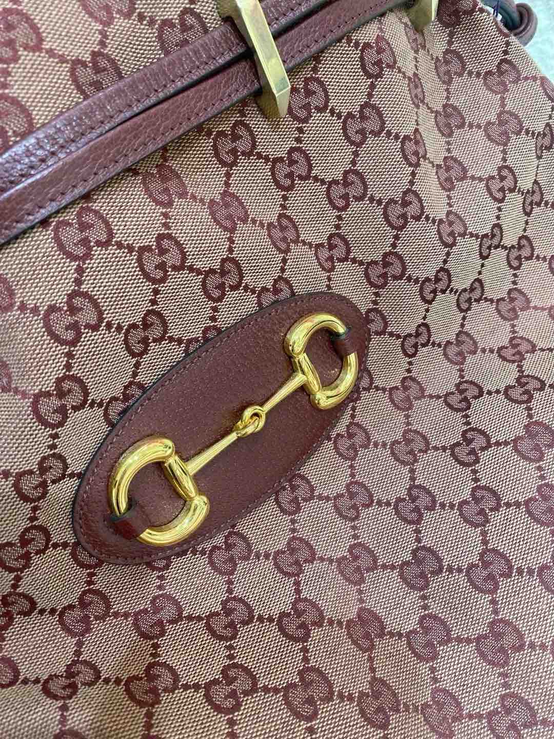 【商品详情】正品二手 Gucci 1955 马衔扣 酒红色 老花 帆布拼皮 邮差包💗97新 36×35。复古时尚